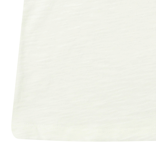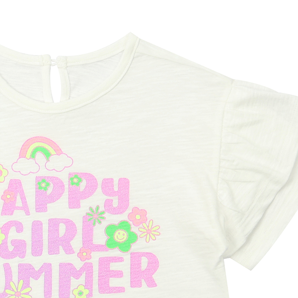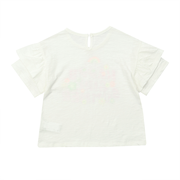 슬럽 소재를 사용하여 시원한 느낌을 주었고 소매 겉에 프릴 단을 올려서 포인트를 주었습니다. 가슴 중심에는 형광 컬러감을 넣어 화려한 느낌을 주었습니다