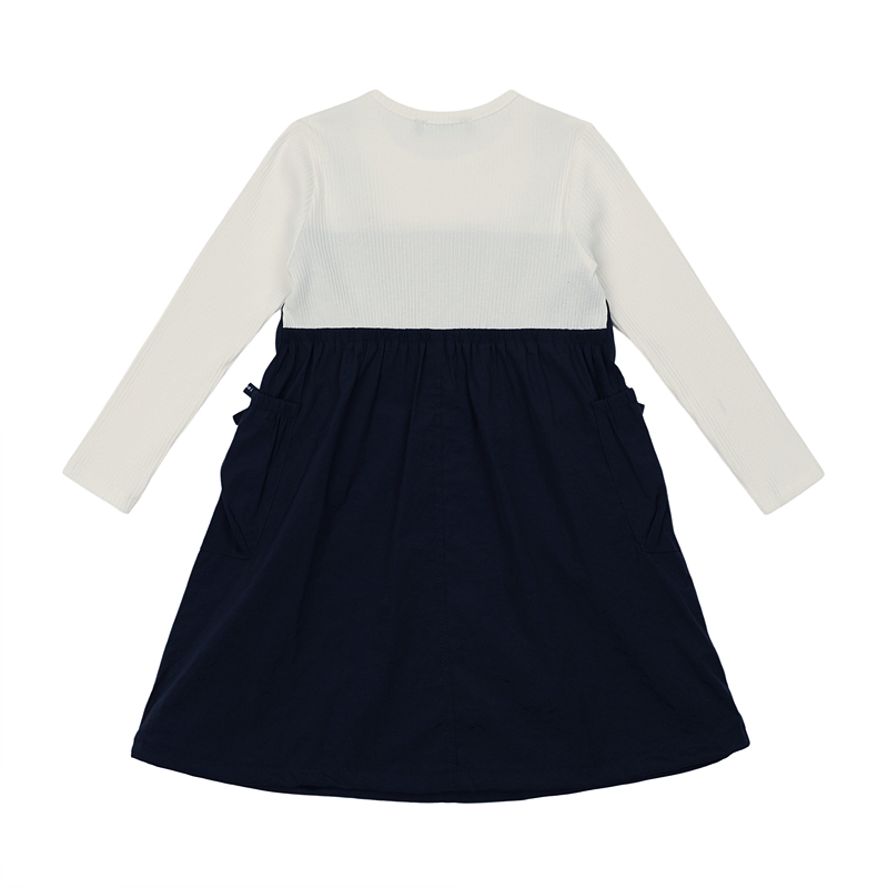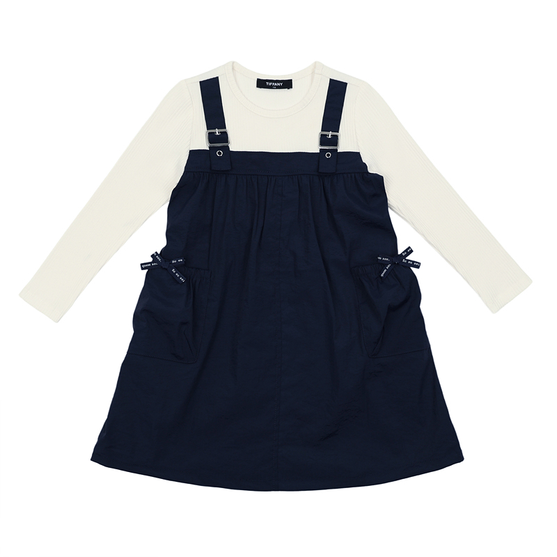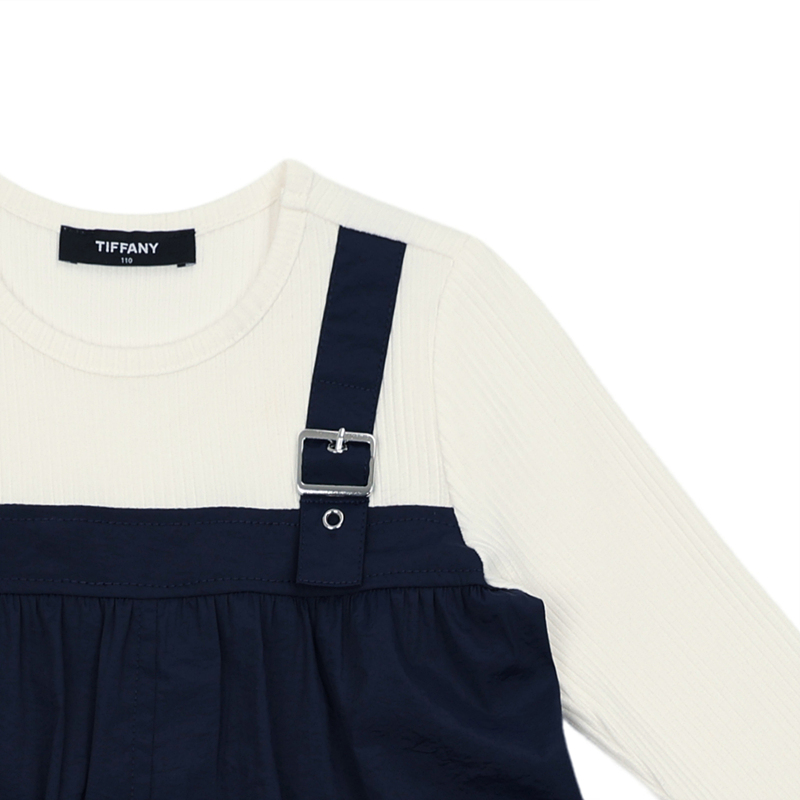 네이비 컬러 화섬 소재의 끈 원피스로 레이어드 한듯한 캐쥬얼 원피스입니다