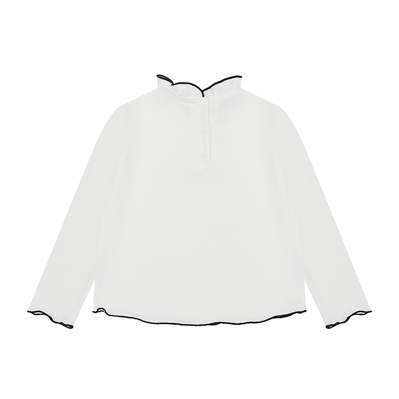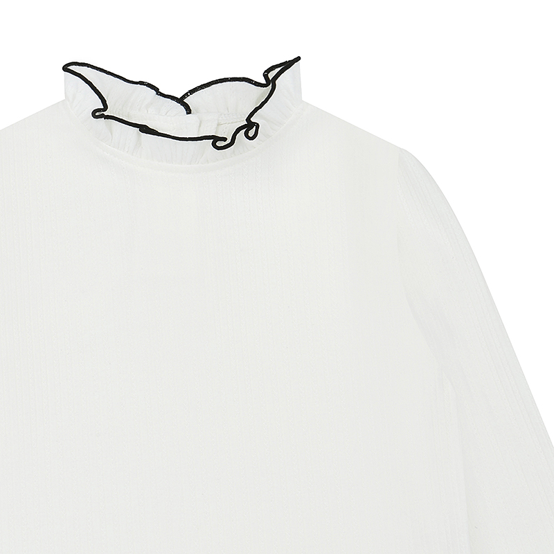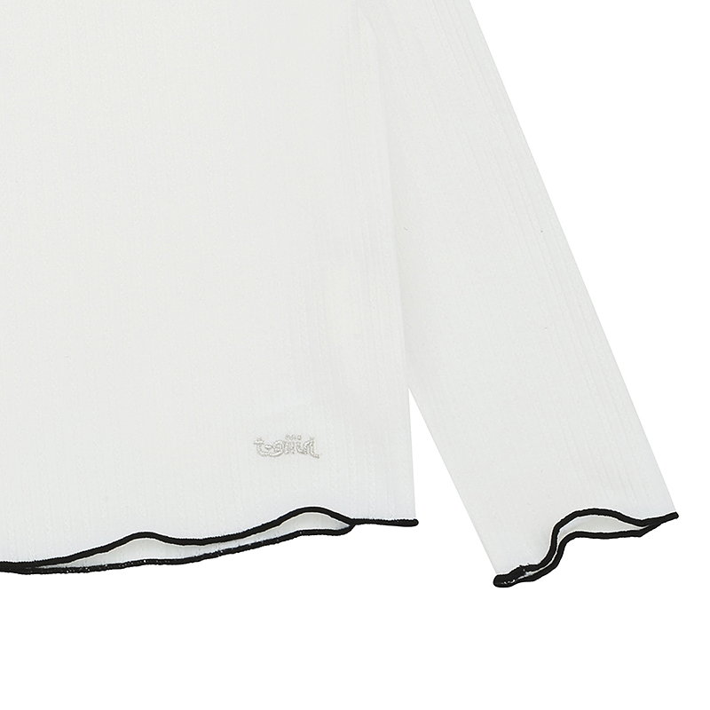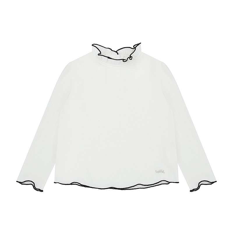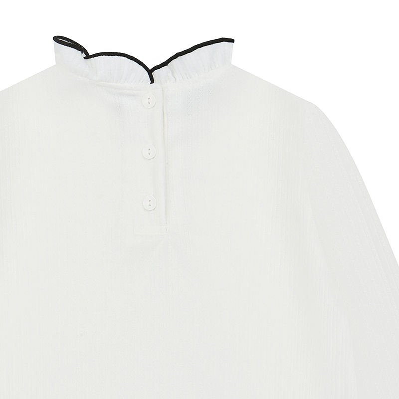 아일렛지 소재 프릴넥 티로 프릴끝 밑단 소매끝에 배색 블랙 컬러 인타록 장식으로 포인트를 준 티셔츠입니다. 단정하게 원피스나 트위드 안에 받쳐 입기 좋은 티셔츠입니다.