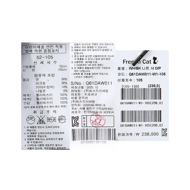 겉감 면39 아크릴38 기타(지정외)14 나일론9배색1 폴리에스터100배색2 폴리에스터100안감 폴리에스터100 -