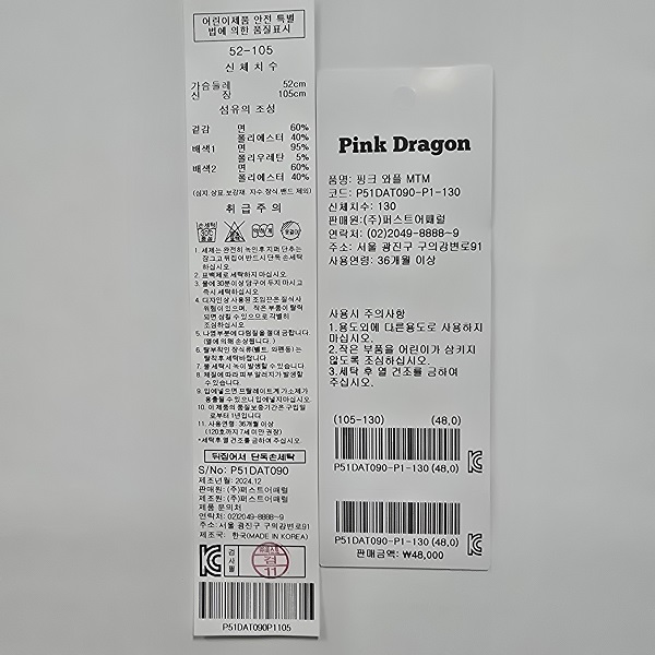 겉감 : 면 60 폴리에스터 40 배색 1 면 95 폴리우레탄 5 배색 2 면 60 폴리에스터 40 -