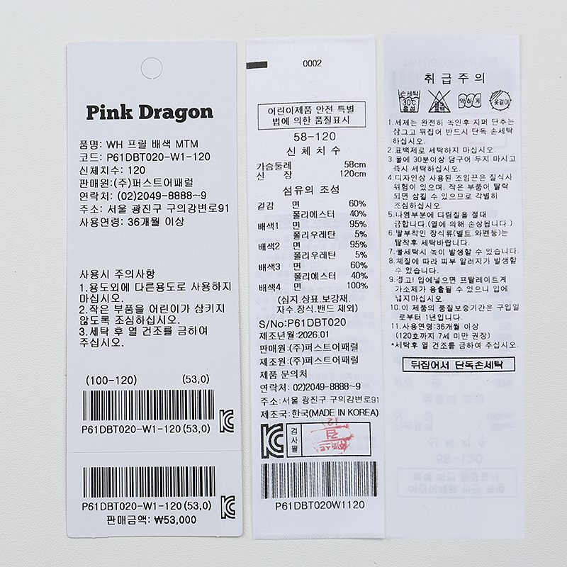 겉감 : 면 60 폴리에스터 40 배색 1 면 95 폴리우레탄 5 배색 2 면 95 폴리우레탄 5 배색 3 면 60 폴리에스터 40 배색 4 면 100 -