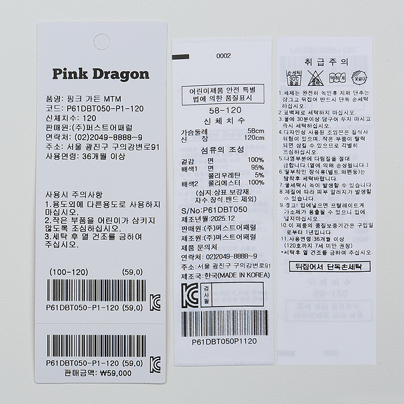 겉감 : 면 100 배색 1 면 95 폴리우레탄 5 배색 2 폴리에스터 100 -