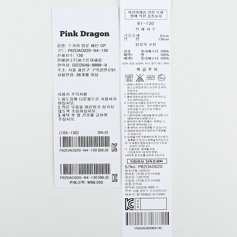 겉감 : 폴리에스터 100 배색 1 면 100 배색 2 폴리에스터 100 -