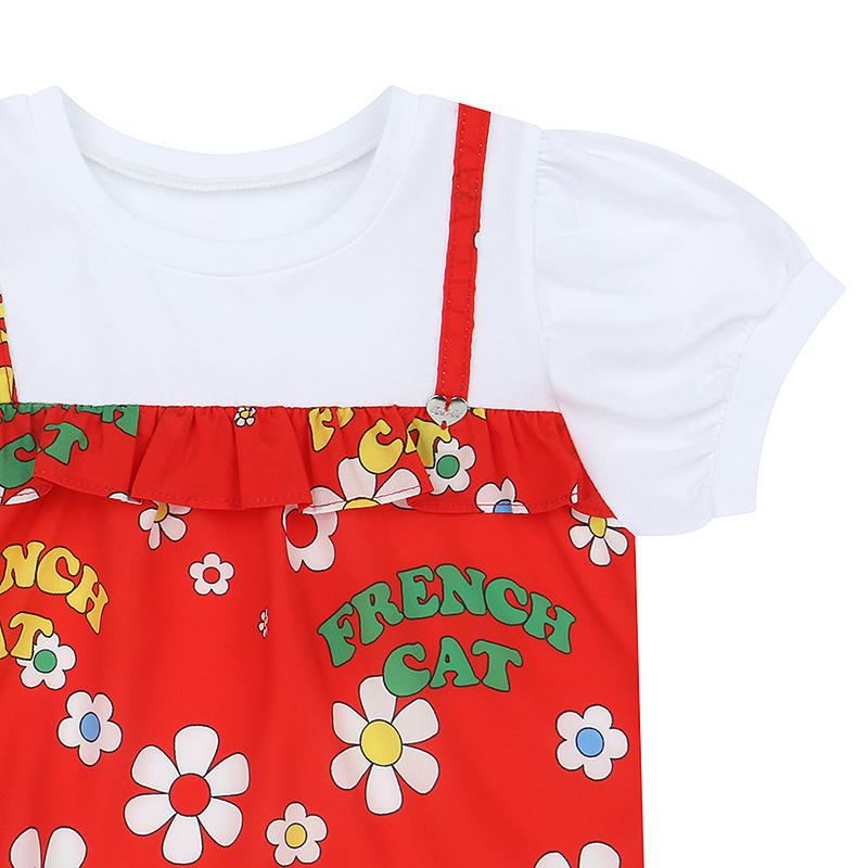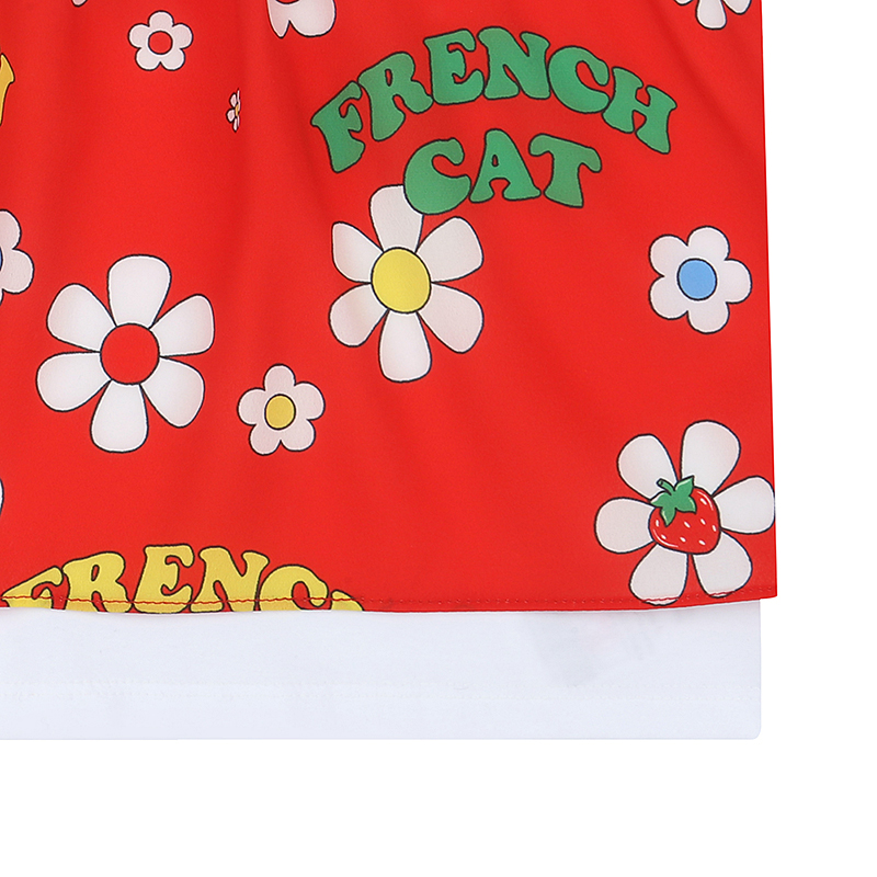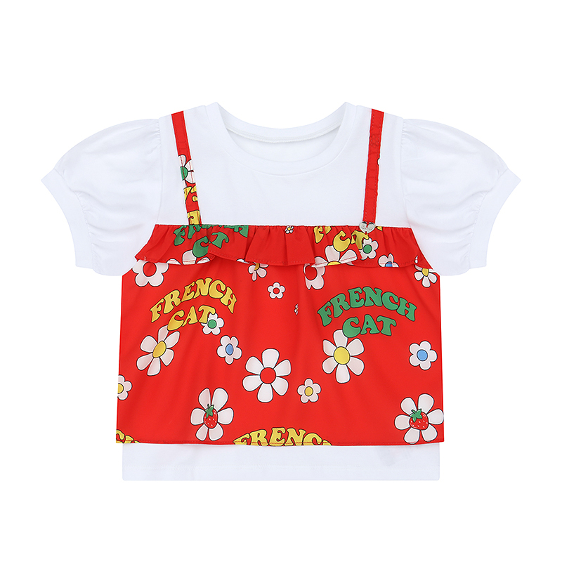 -깔끔한 화이트 반팔 티셔츠 위에 프렌치캣만의 선명한 레드 나염 뷔스티에가 레이어드된 형태로 코디 걱정 없이 간편하게 멋을 낼 수 아이템