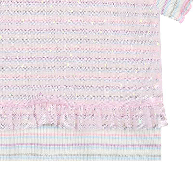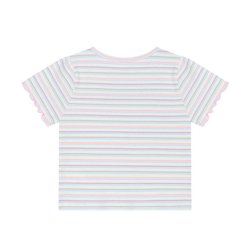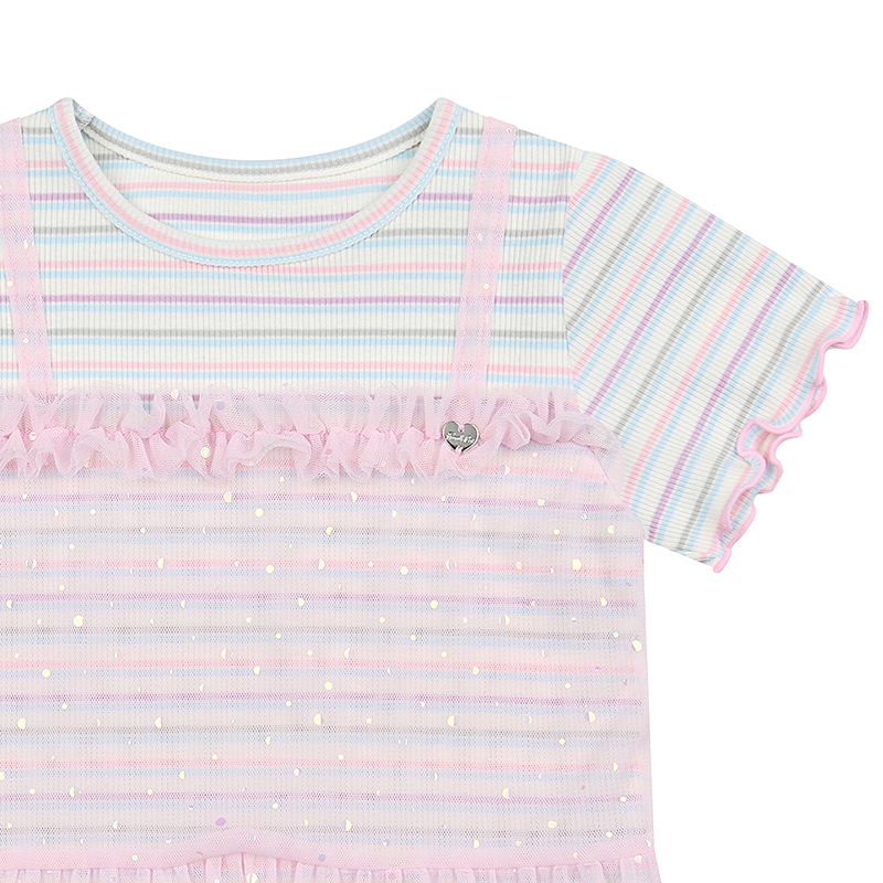 멀티 컬러의 골지 스트라이프 원단에 핑크샤 뷔스티에가 부착된 레이어드 느낌의 티셔츠입니다. PK 티어드 샤 SK와 함께 사랑스럽게 혹은 PK 프릴 요루 PT와 함께 캐주얼하게 다양하게 연출해보세요.