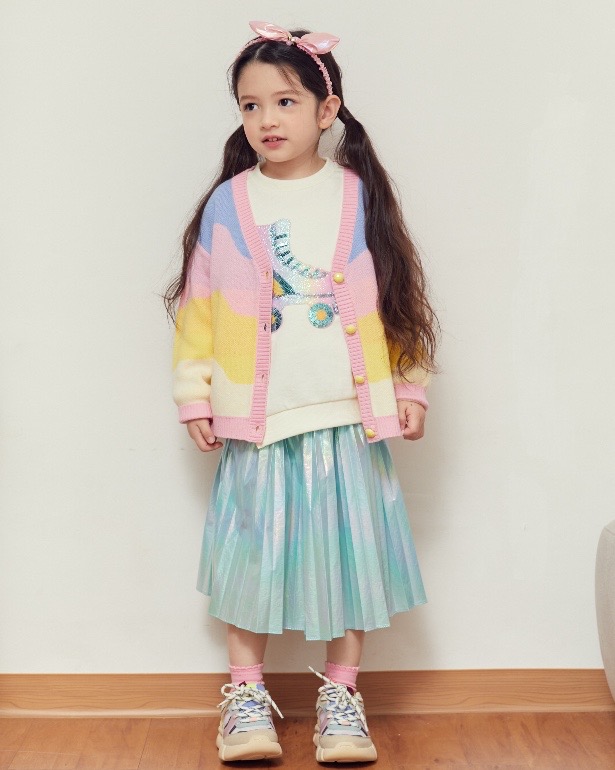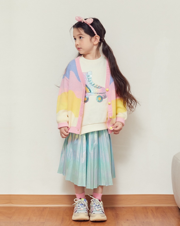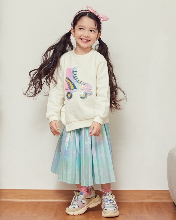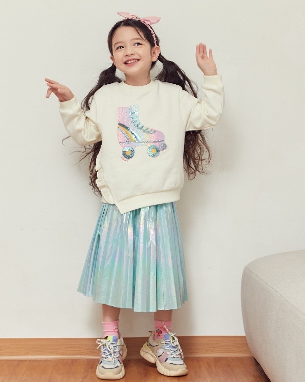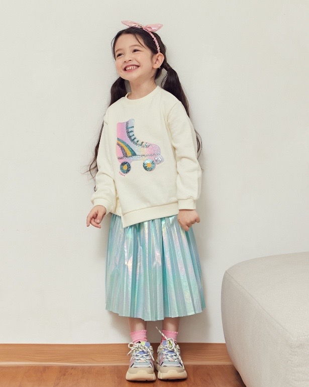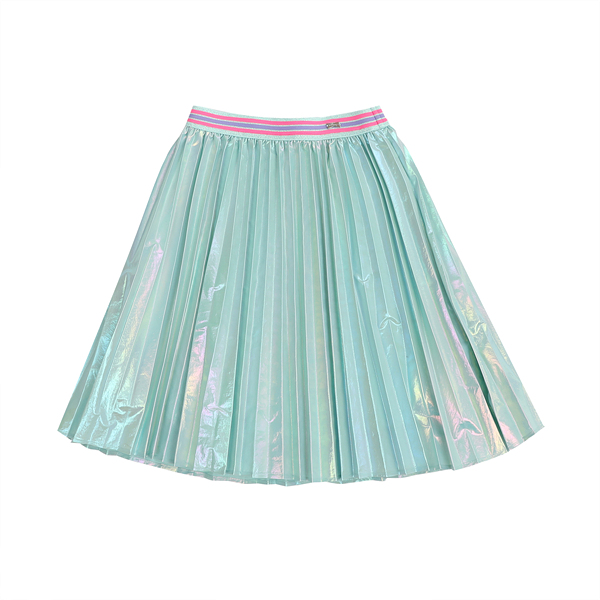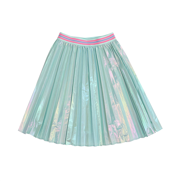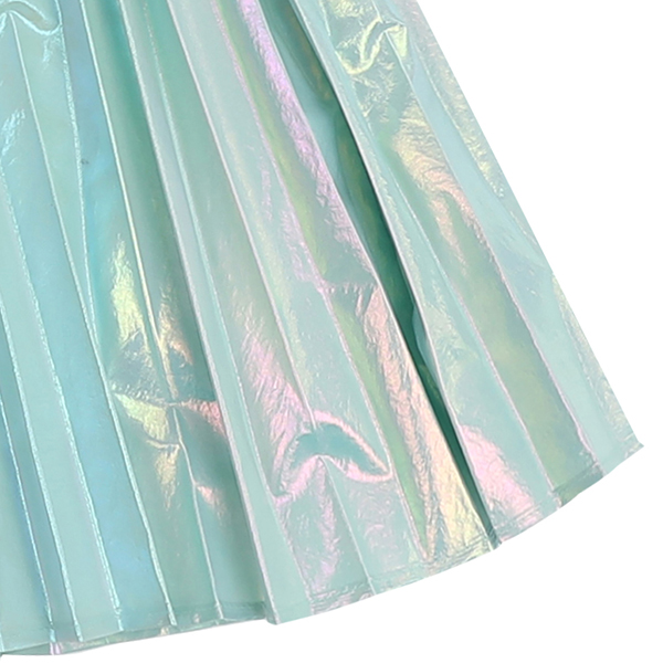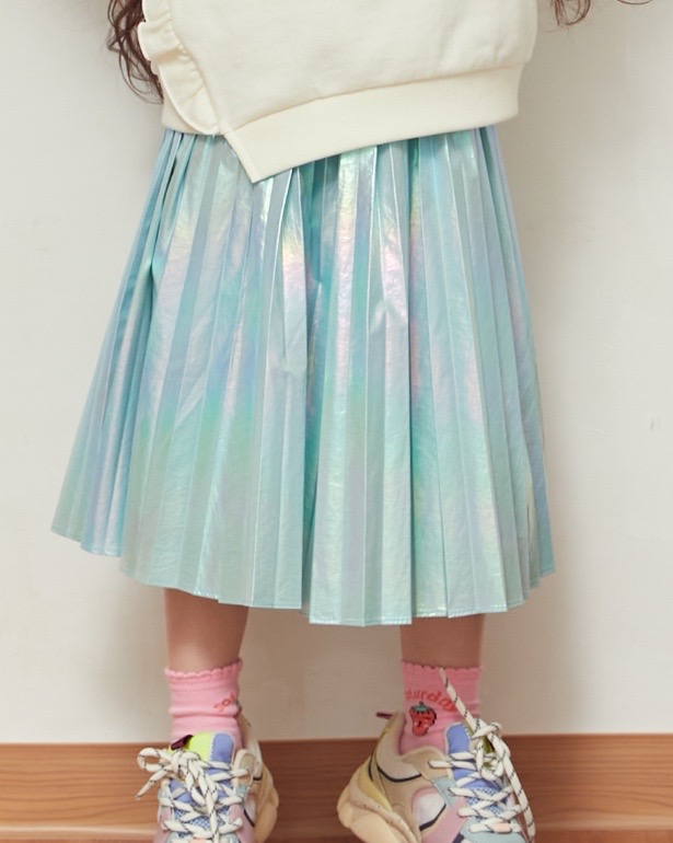 홀로그램소재로 트랜드를 반영한 스타일로 주름을 잡아 멋스럽게 표현한 가벼운 소재의 스커트아이템이다