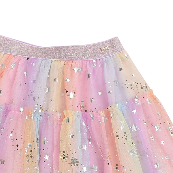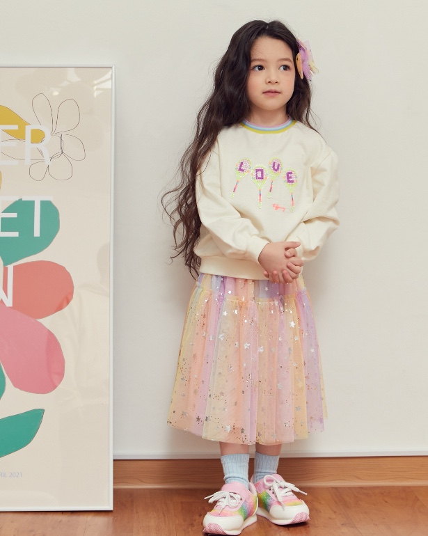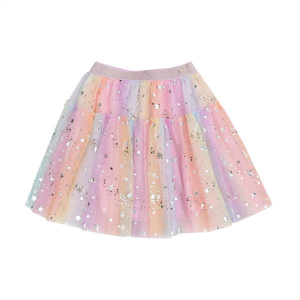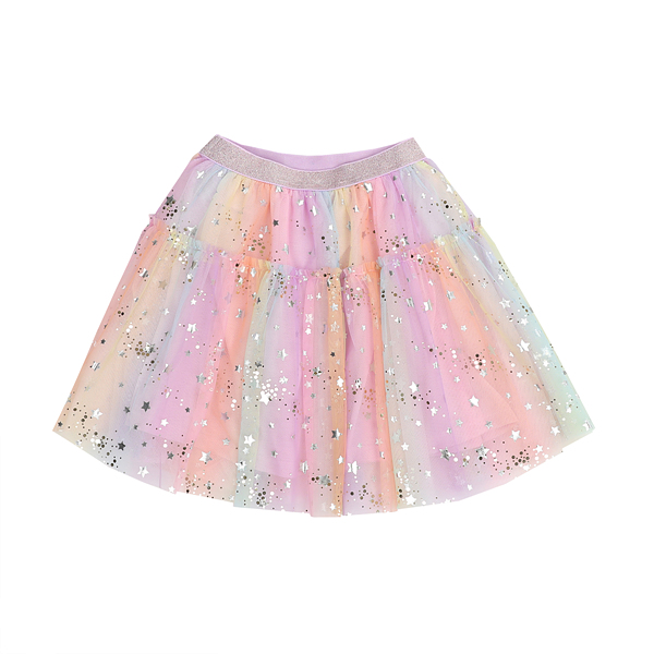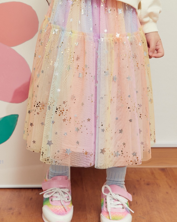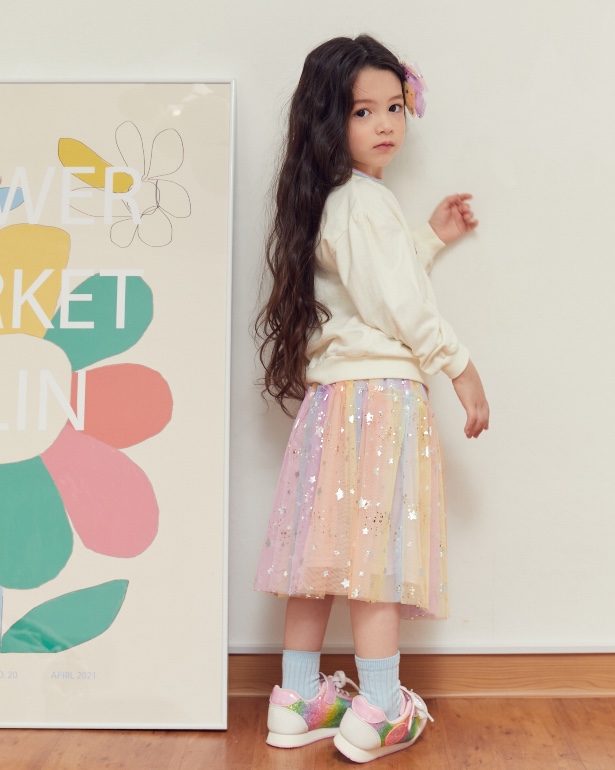 그라데이션 샤 원단에 실버별과 골드 DOT 은하수가 프린팅된 샤 소재를 사용한 롱 스커입니다. 허리 펄 밴드한 롱한 기장으로 볼륨감을 살린 스커트입니다. 멀러 블럭 자켓과 코디하여 트렌디하게 연출할 수도 있습니다.