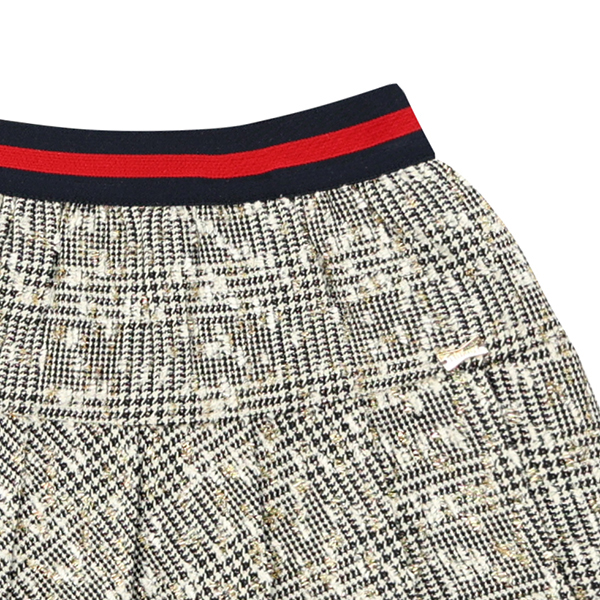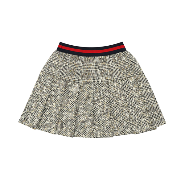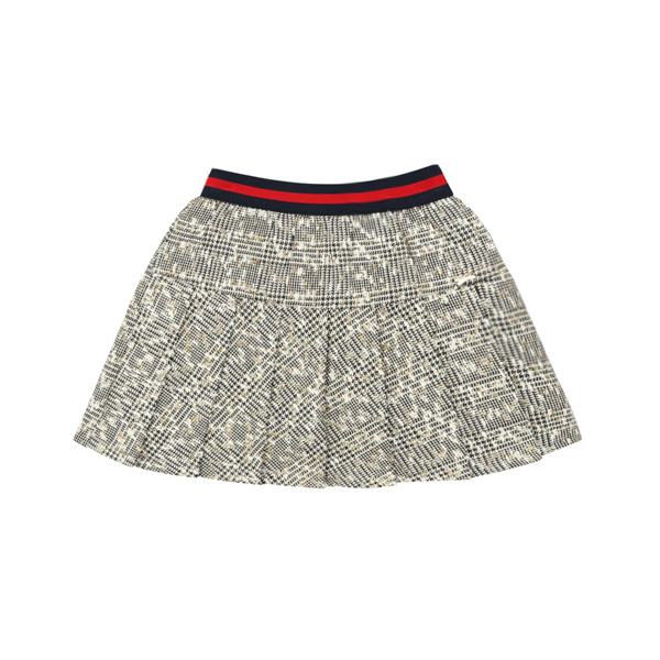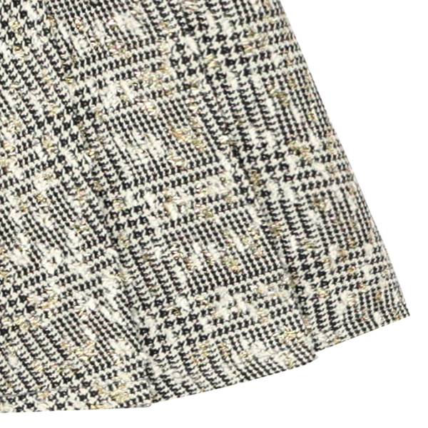 화이트&블랙 체크 소재에 골드 펄감이 전체적으로 들어가 포인트를 주는 스커입니다. 밑단에는 전체적으로 주름을 잡아 깔끔하게 연출하기 좋은 스타일입니다. 레드 가디건이나 블록 니트 베스트와 코디하여 신학기에 스타일리쉬하게 연출하기 좋은 스커트입니다.