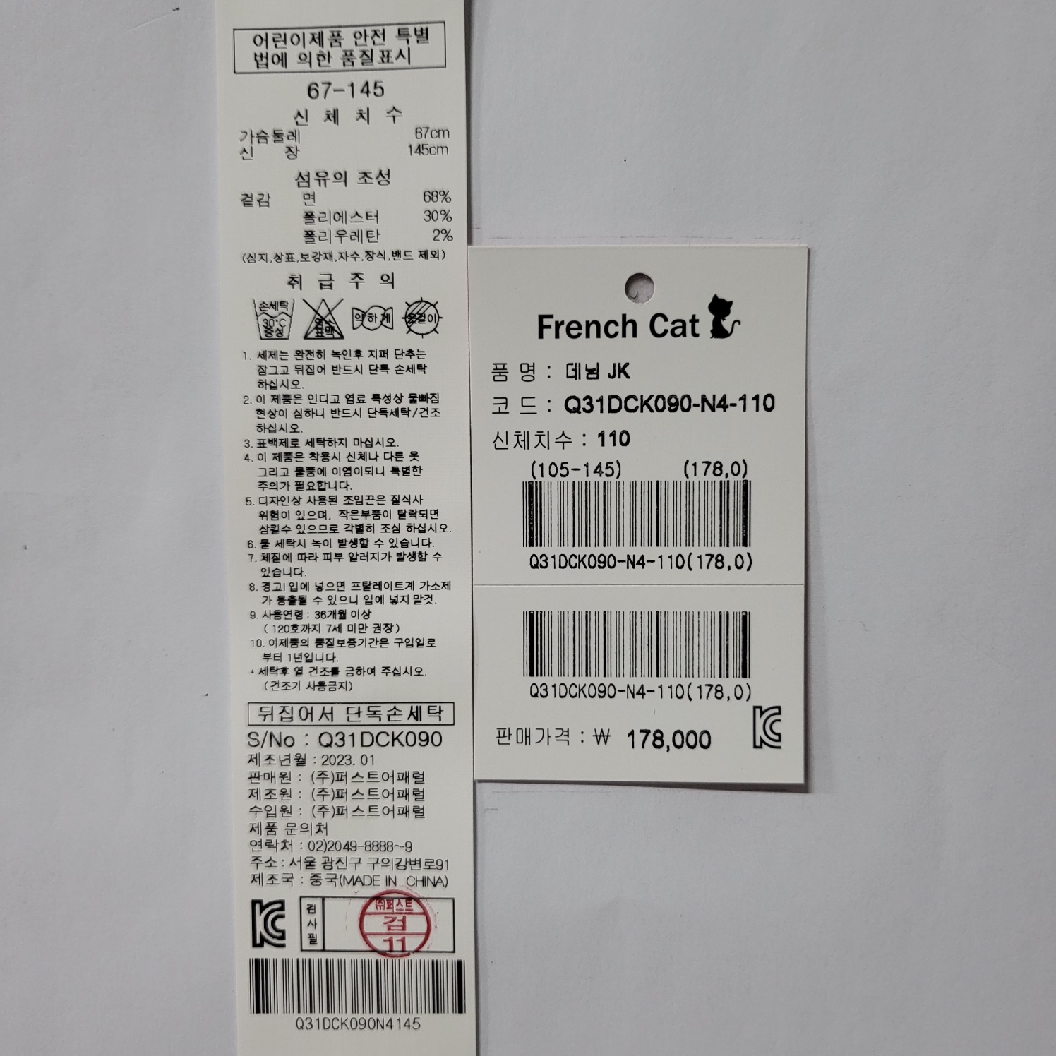겉감: 면 68%+폴리에스테르 30%+폴리우레탄 2% -