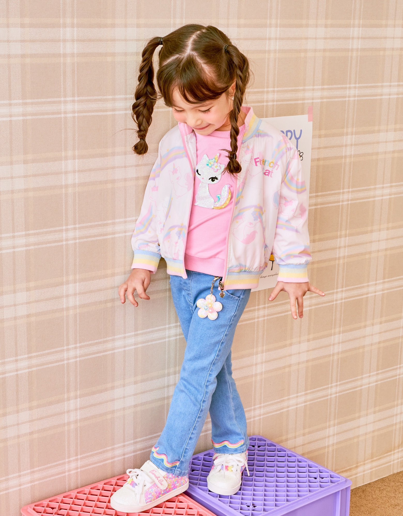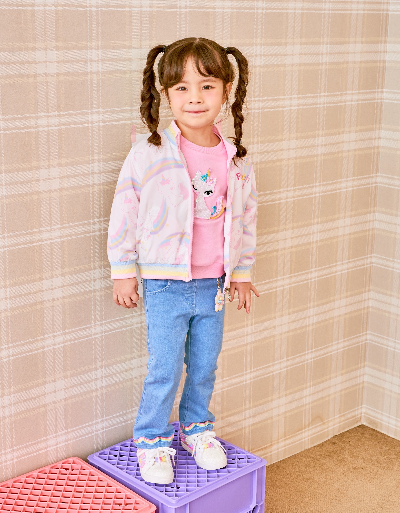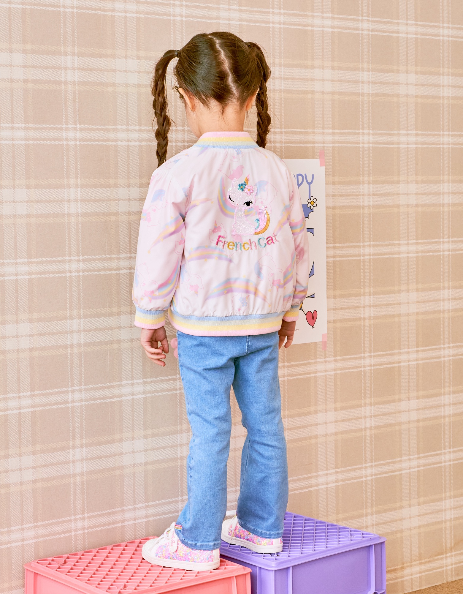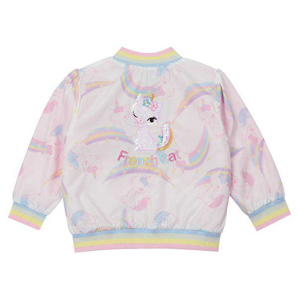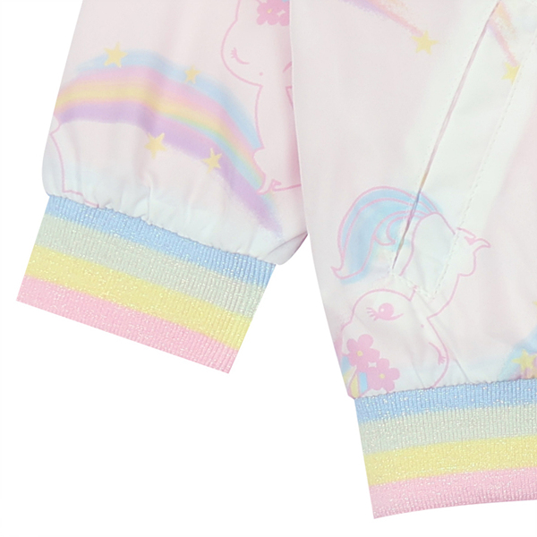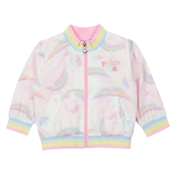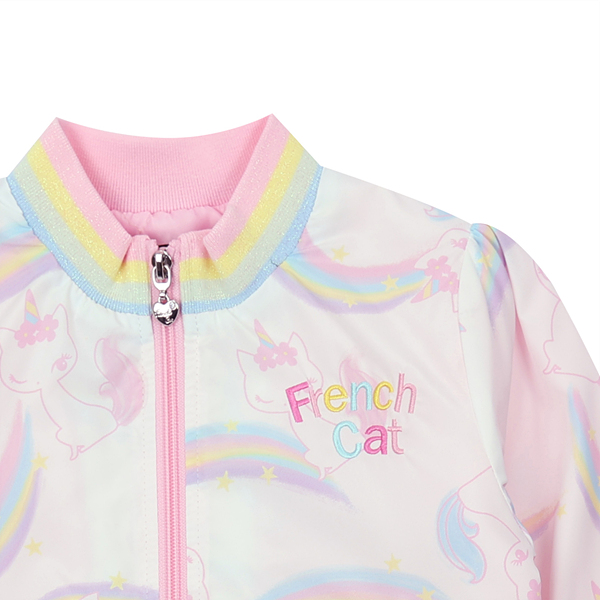 알록 달록한 무지개와 귀여운 프캣 고양이가 어울어진 프린트 화섬 점퍼 입니다.