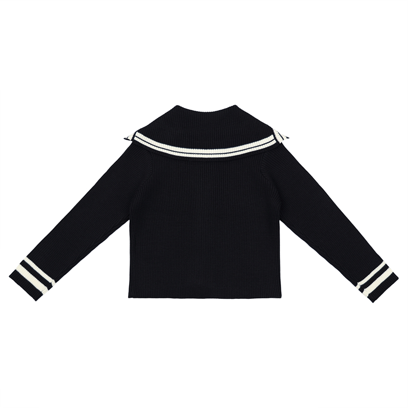 골지 집업 니트 가디넉으로 카라 끝에 스트라이프 RIB단으로 포인트를 준 스타일입니다. 깔금한 라인으로 코디하여 연출하기 좋은 스타일입니다. 가슴에 와펜 장식이 포인트로 있습니다.