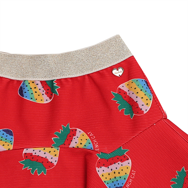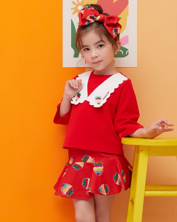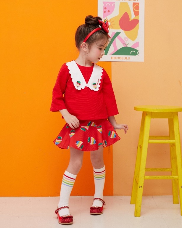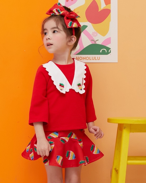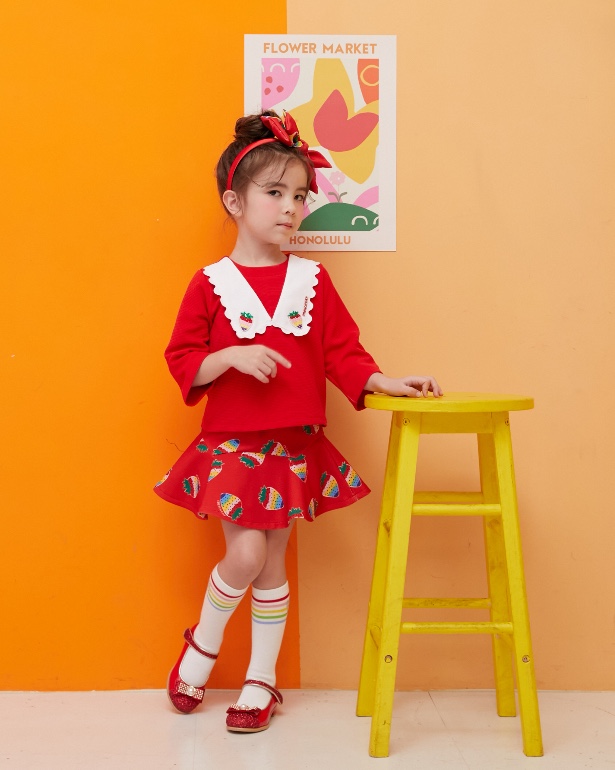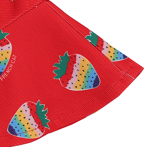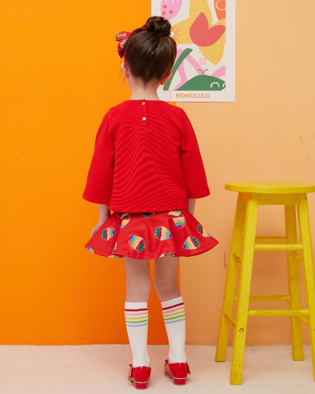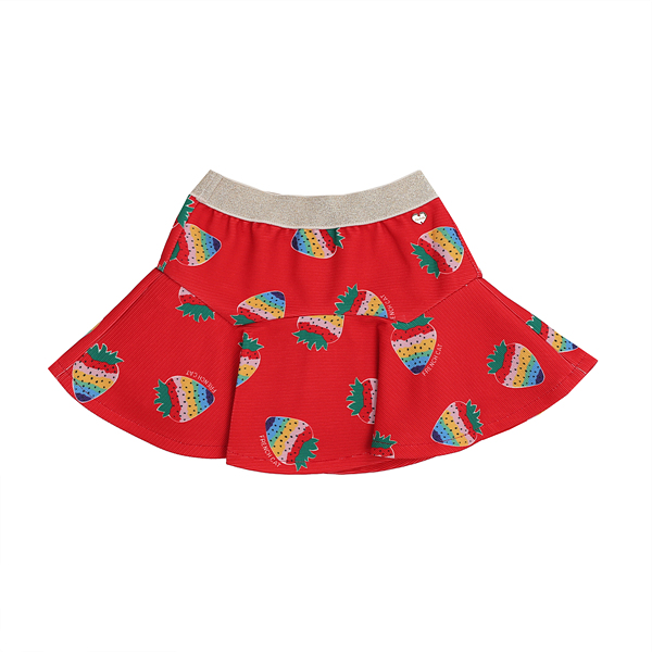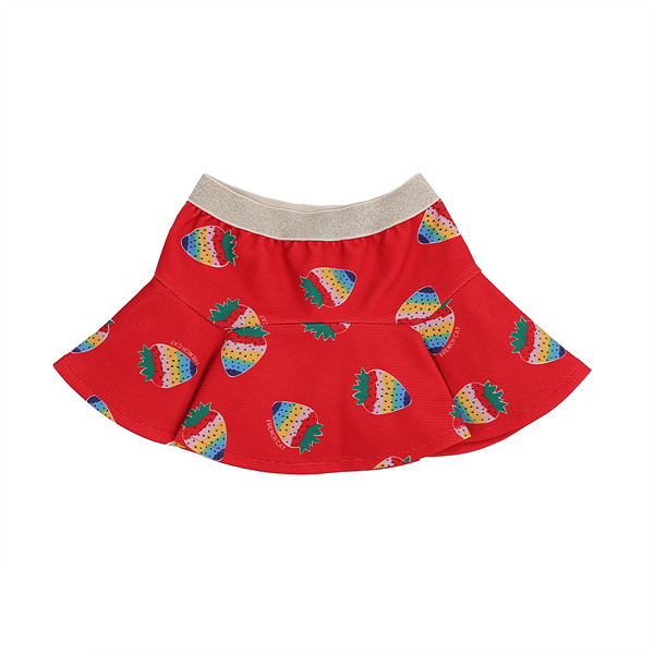 레드 딸기 프린트가 있는 져지 스커트 입니다.