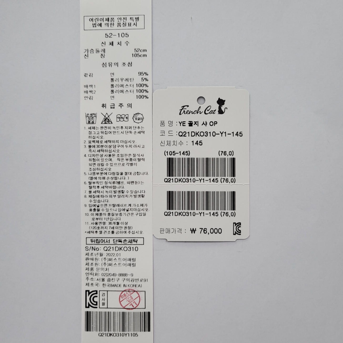 겉감:면95 폴리우레탄5배색1:폴리에스터100배색2:폴리에스터100안감:면100 -