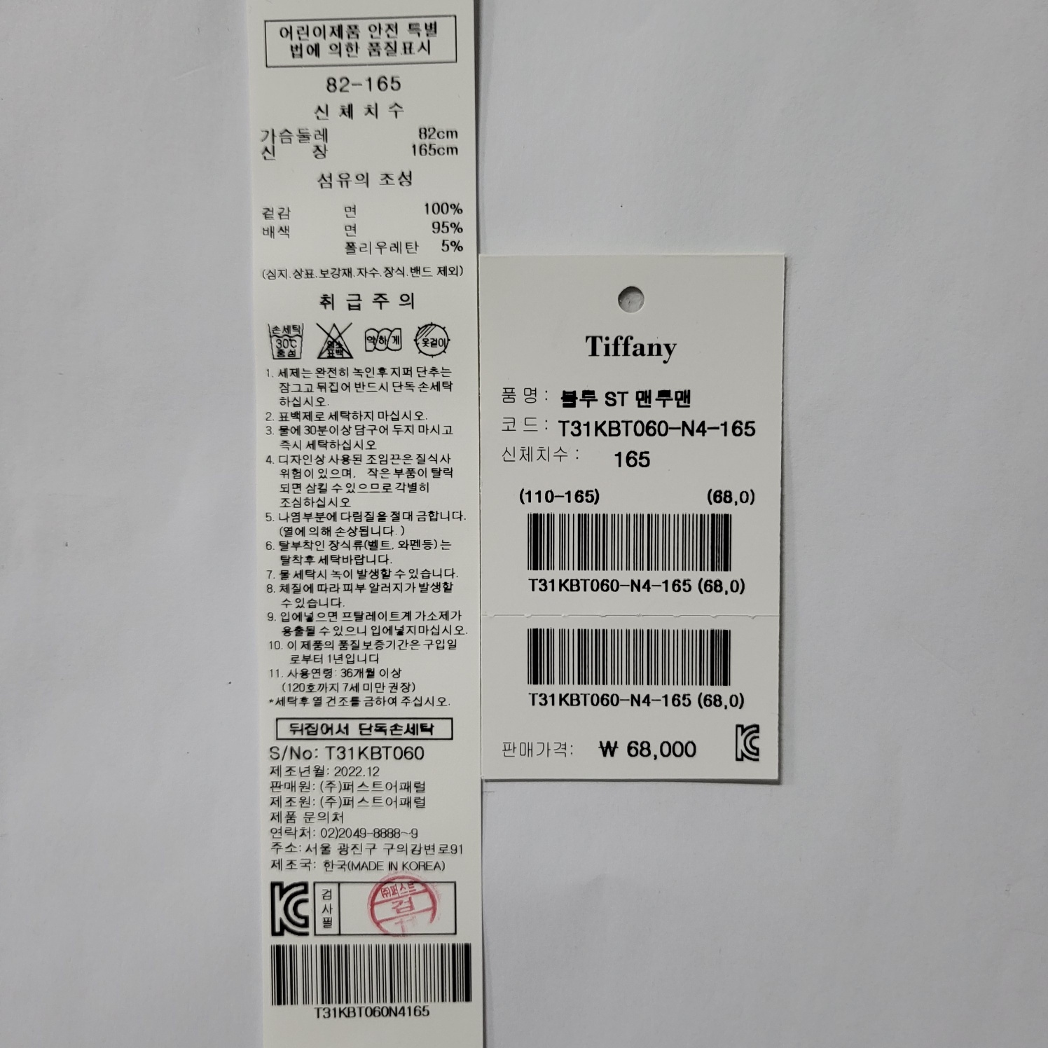 겉감 : 면 100 배색 면 95 폴리우레탄 5 -