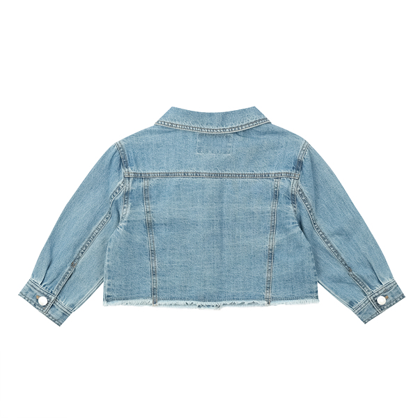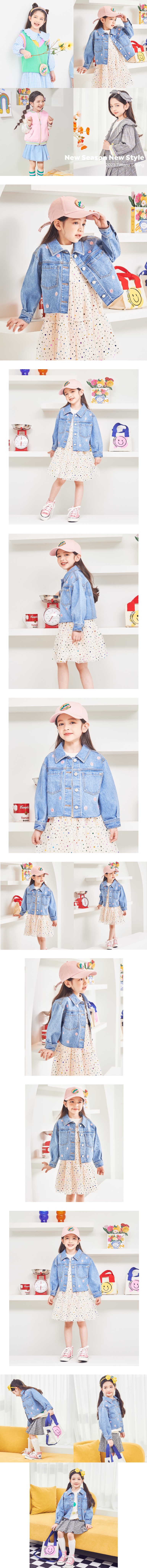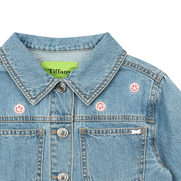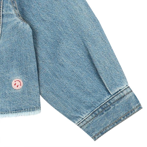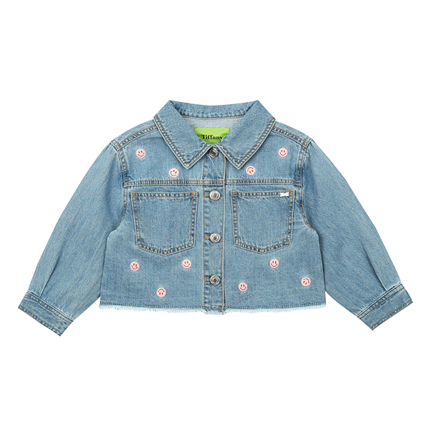 조직감이 있는 데님 소재이며 앞판에 핑크 스마을 포인트가 잔잔하게 자수 작업되어있는 귀여운 느낌의 아이템이며 어떠한 버텀스타일과 모두 잘 어울리는 아이템이다 .