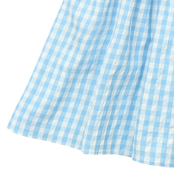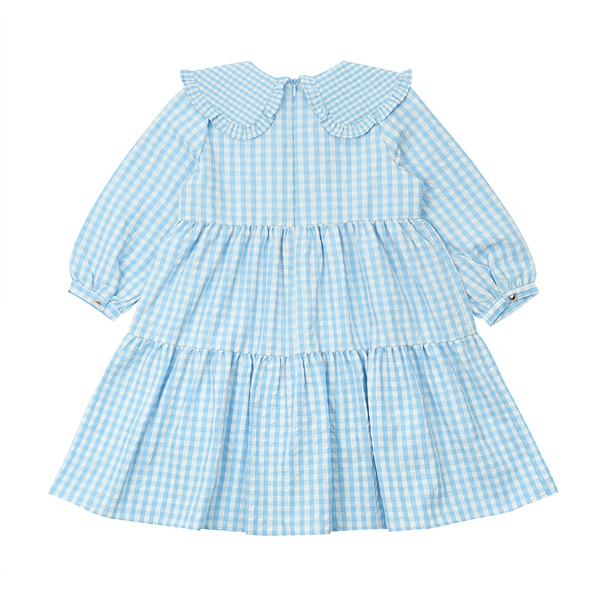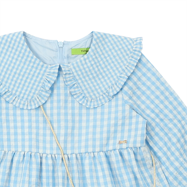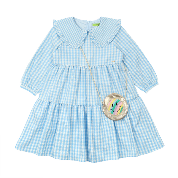 블루 컬러감의 깅엄체크 패텬에 귀여운 빅카라로 포인트 준 사랑스러운 느낌원피스로 실버가방에 스마일 자수작업하여