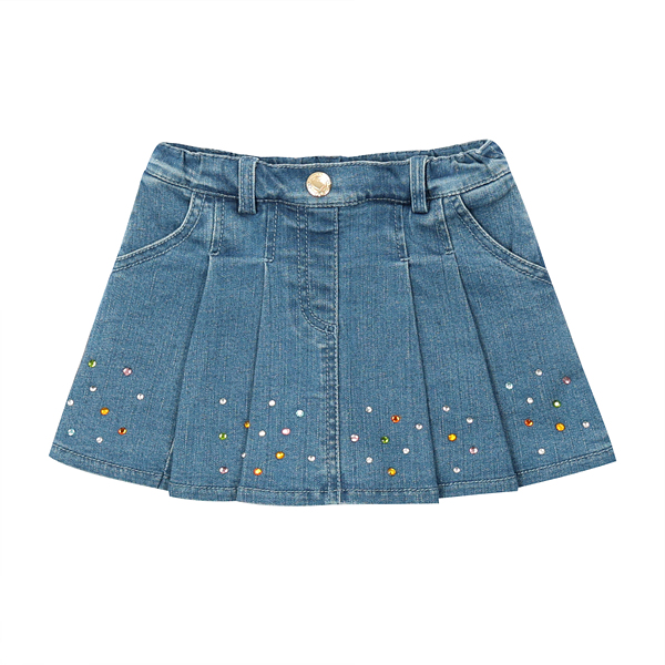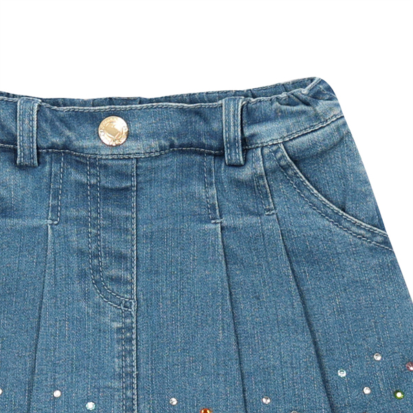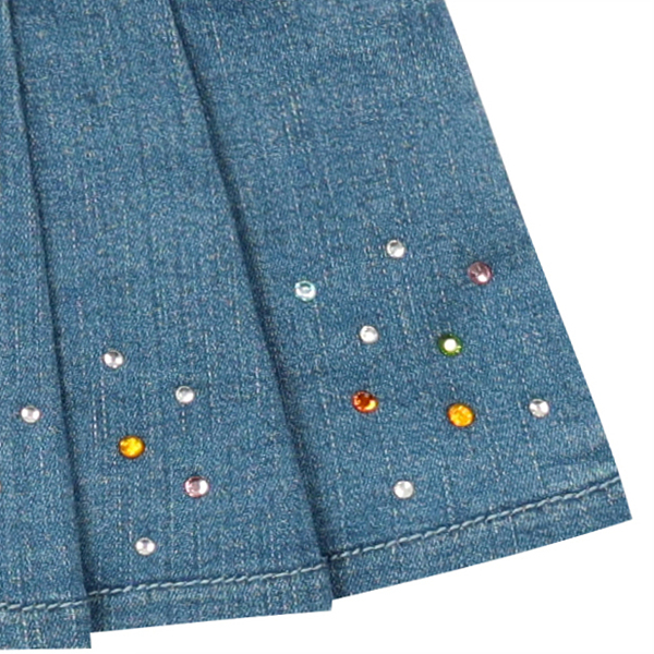 주름 잡힌 스커트 랩단이 달린 신축성 좋은 데님 스커트 팬츠입니다. 밑단에 블링블링한 멀티 컬러 믹스 핫피스가 포인트 되는 제품입니다. 블링한 봄날의 팬츠를 장만해 보세요.