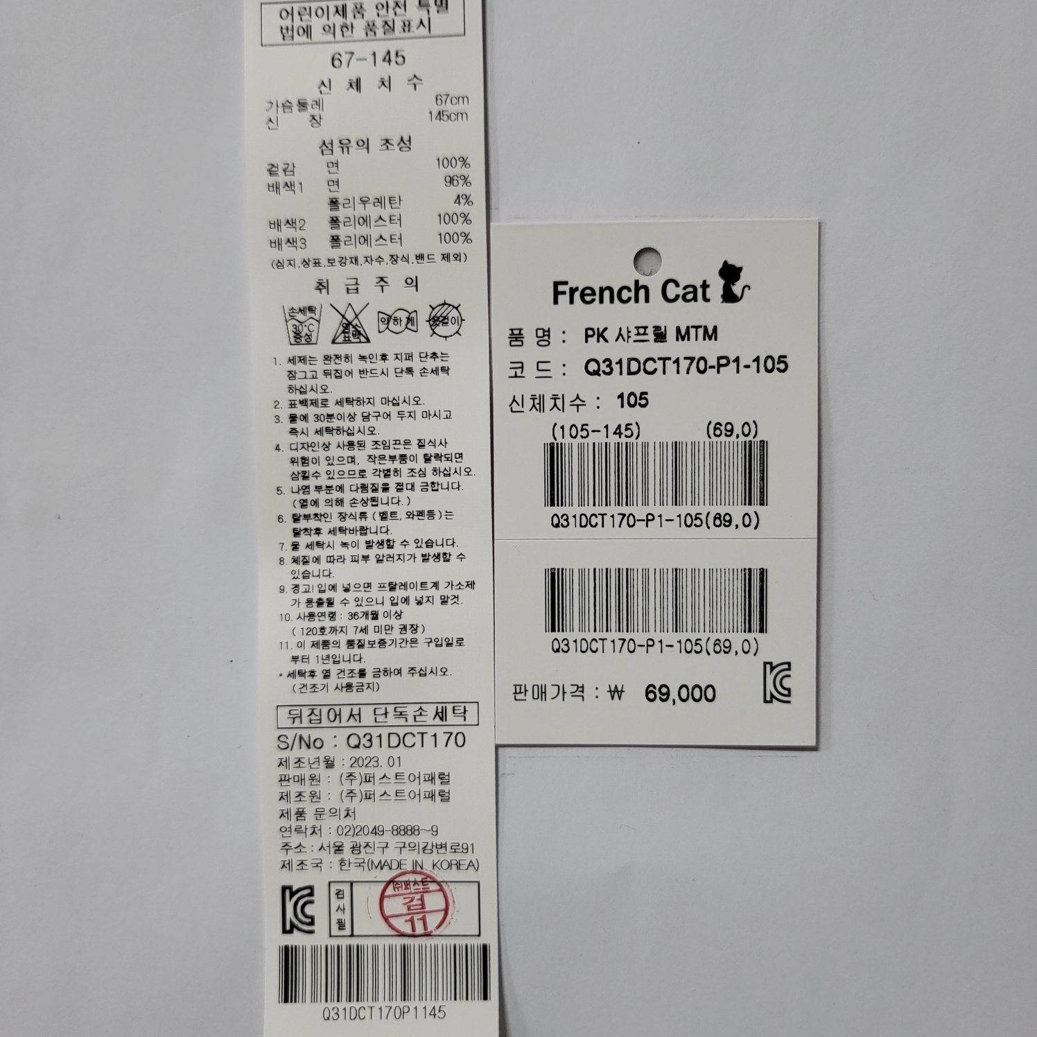 겉감 : 면 100%배색 1:면 96%+폴리우레탄 4%배색 2: 폴리에스테르 100%배색 3: 폴리에스테르 100% -