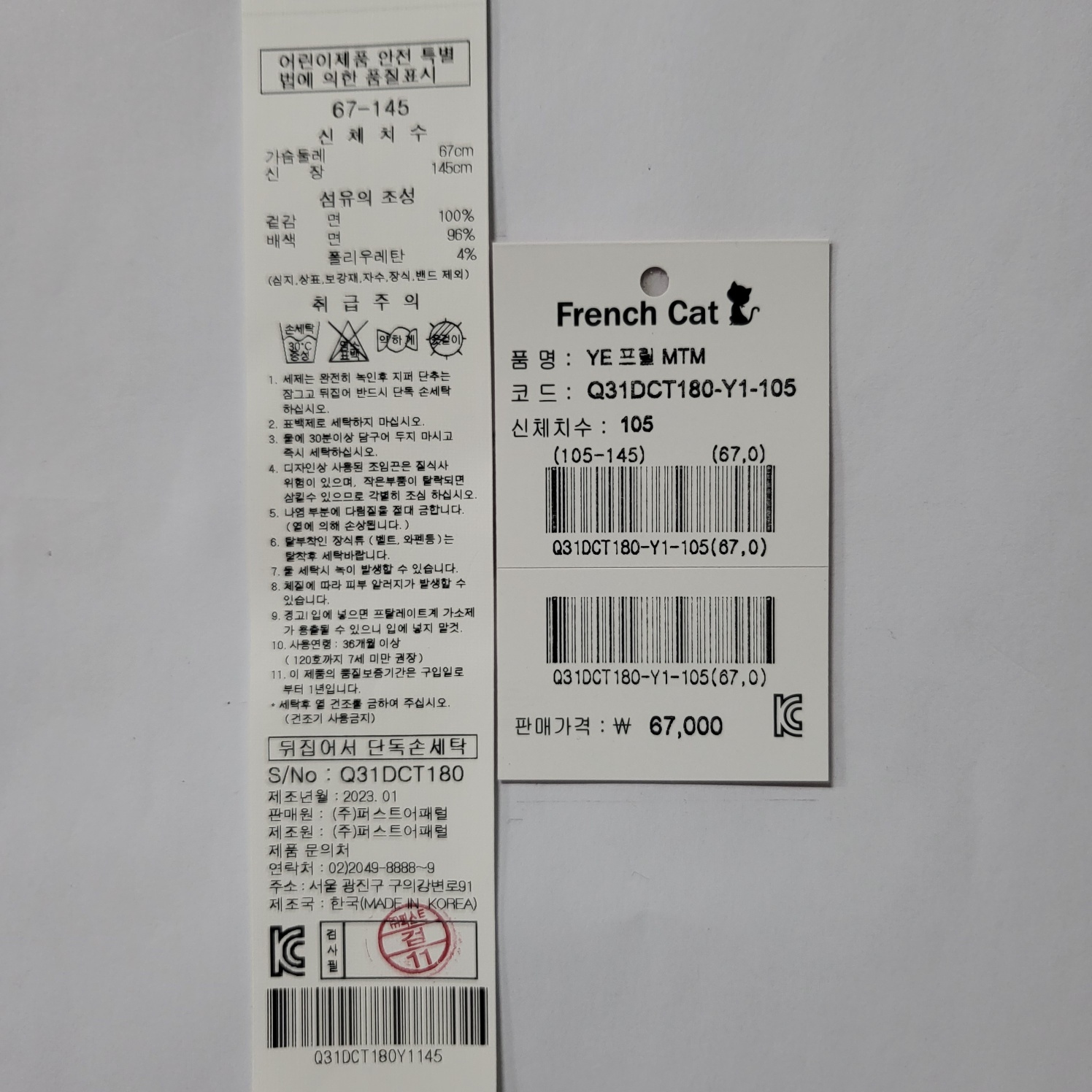 겉감 : 면 100%배색 1: 면96%+폴리우레탄 4%배색2 : 폴리에스테르 100%배색 3: 폴리에스테르 100% -