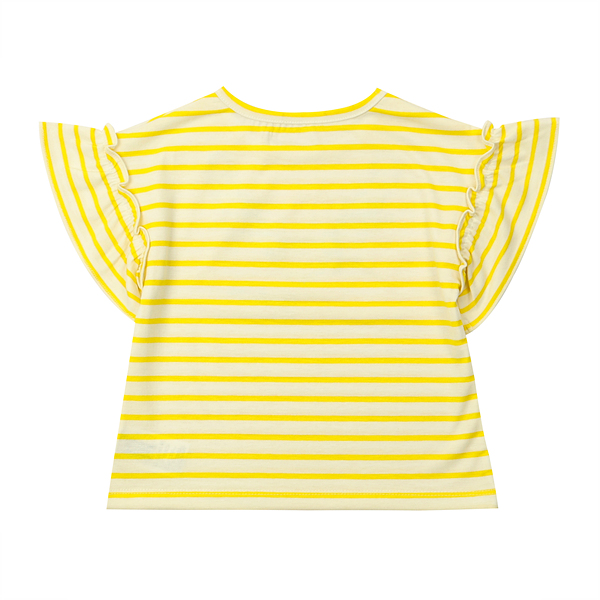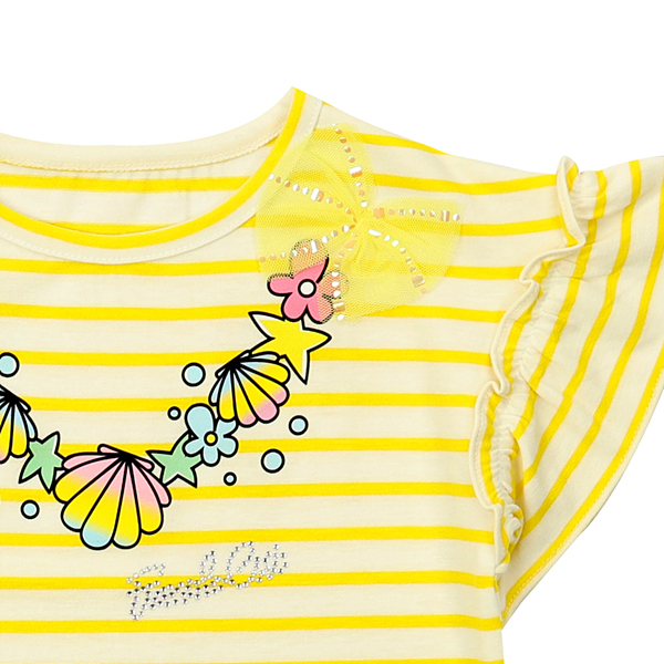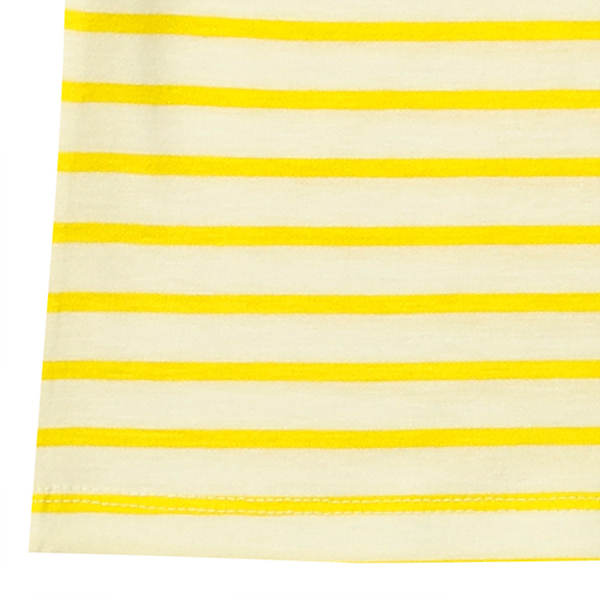 드롭숄더의 산뜻한 노란색 스트라이프 티셔츠입니다. 마치 목걸이를 한 것 같은 앞판의 프린트와 샤 리본이 포인트가 되는 제품입니다.