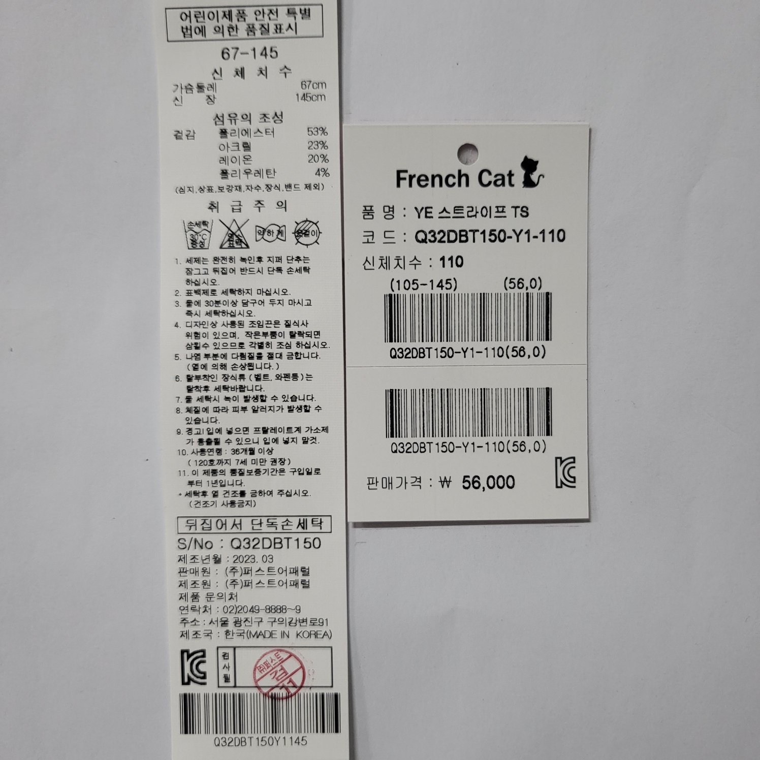 겉감 폴리에스테르53 / 아크릴23 / 레이온20 / 폴리우레탄4 -