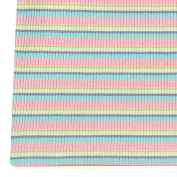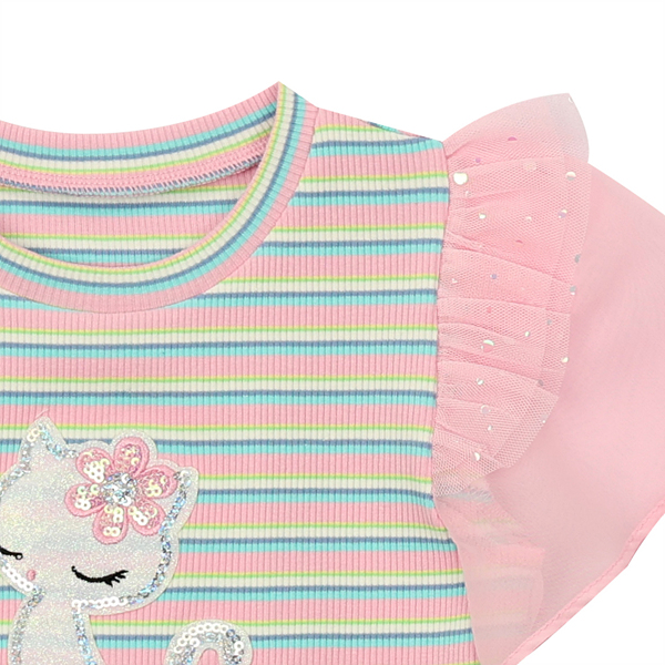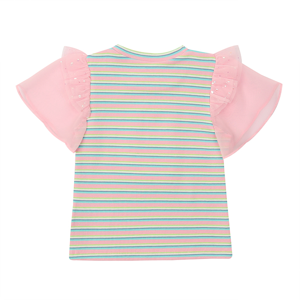 멀티 스트라이프 골지 티에 핑크 쉬폰으로 배색 포인트를 준 귀여운 티셔츠 입니다.