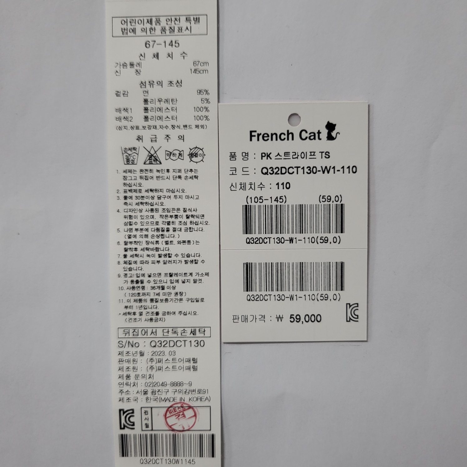 겉감 : 면 95%+폴리우레탄 5%배색1: 폴리에스테르 100%배색2: 폴리에스테르 100% -
