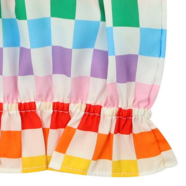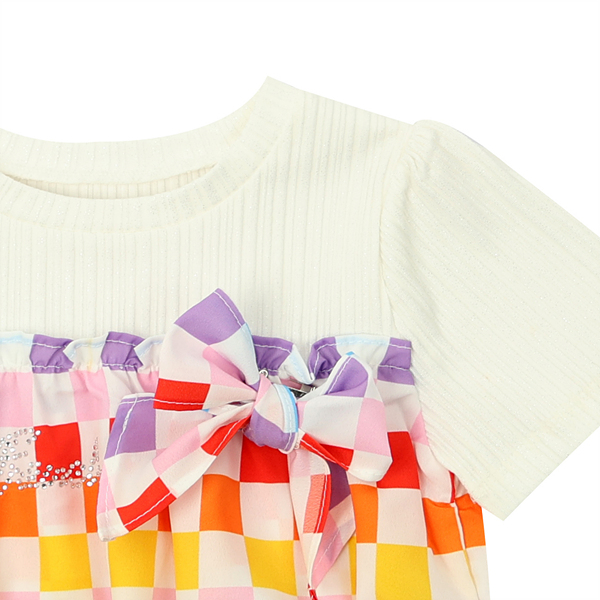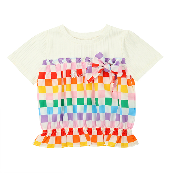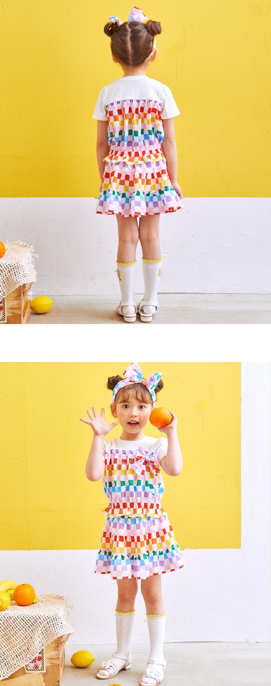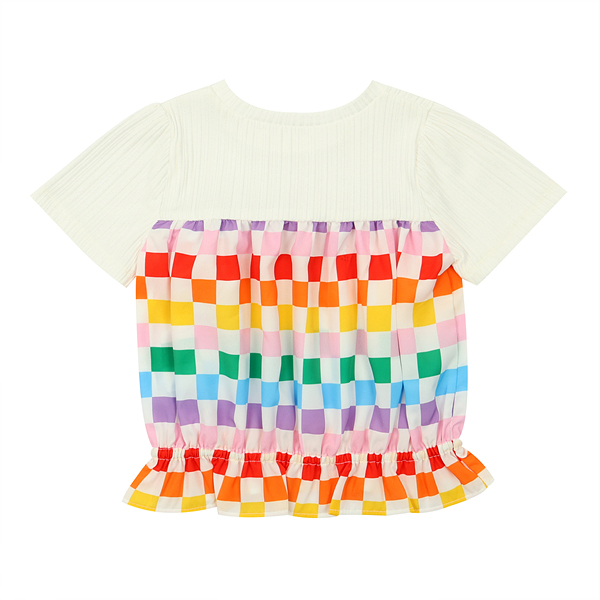 은은한 펄골지원단에 경쾌한 멀티 체크 우븐 원단이 배색되어 블라우스 같은 느낌의 티셔츠입니다. 조임없이 편하게 입을 수 있는 제품으로 멀티 체크 SK와 셋업 연출을 하기 좋은 제품입니다.
