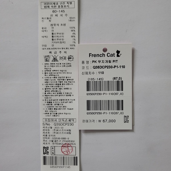 겉감 : 면 100%배색 1 : 면 96% +폴리우레탄 4%배색 2 : 폴리에스테르 98%+폴리우레탄 1% +기타(지정외) 1%안감 : 면 100% -