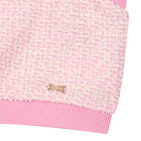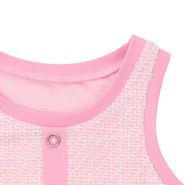 잔잔한 핑크 다이마루 트위드 소재를 사용한 VSET 스타일입니다. 같은 소재 주름 스커트나 데님 팬츠와 코디하여 연출하기 좋은 스타일입니다.