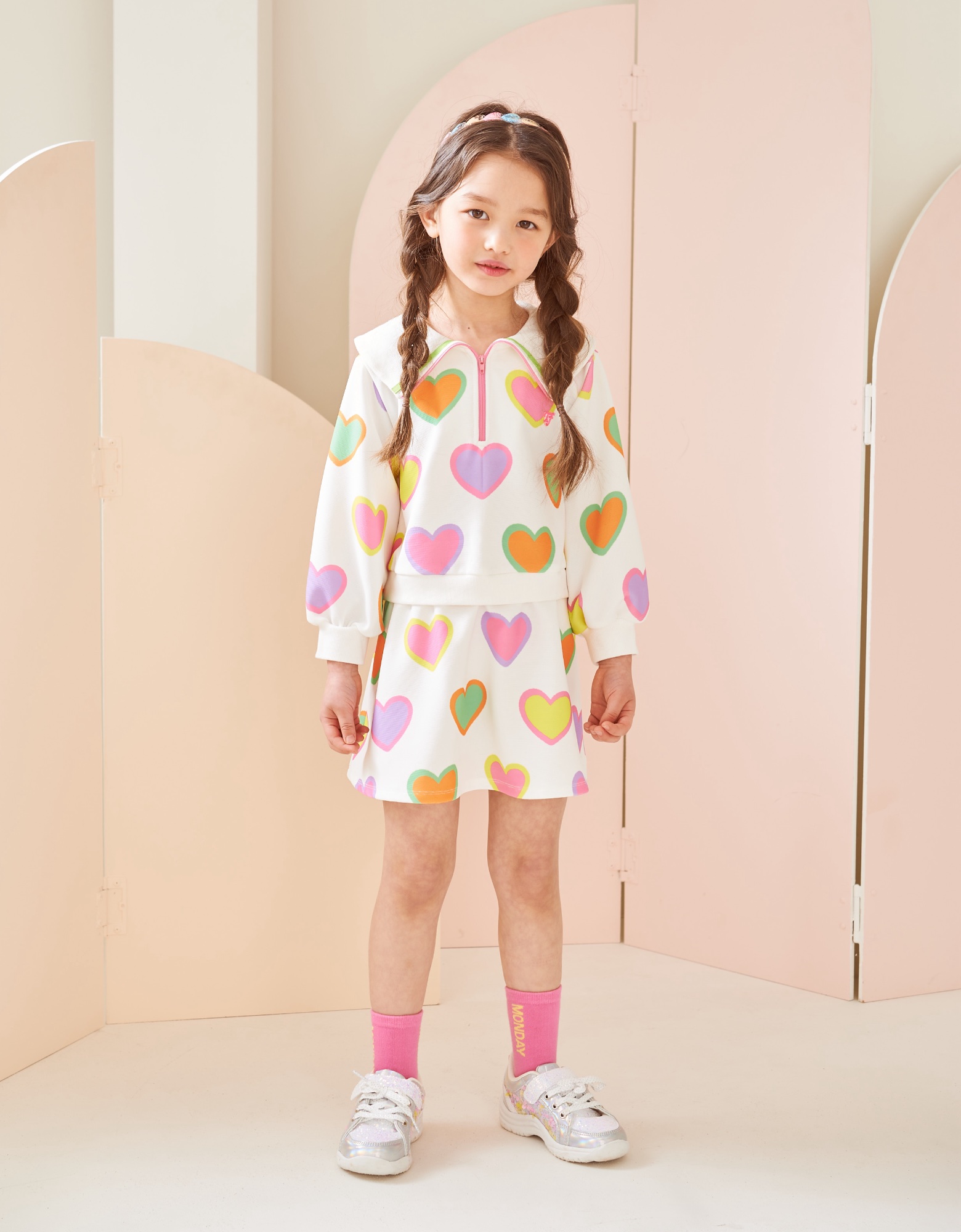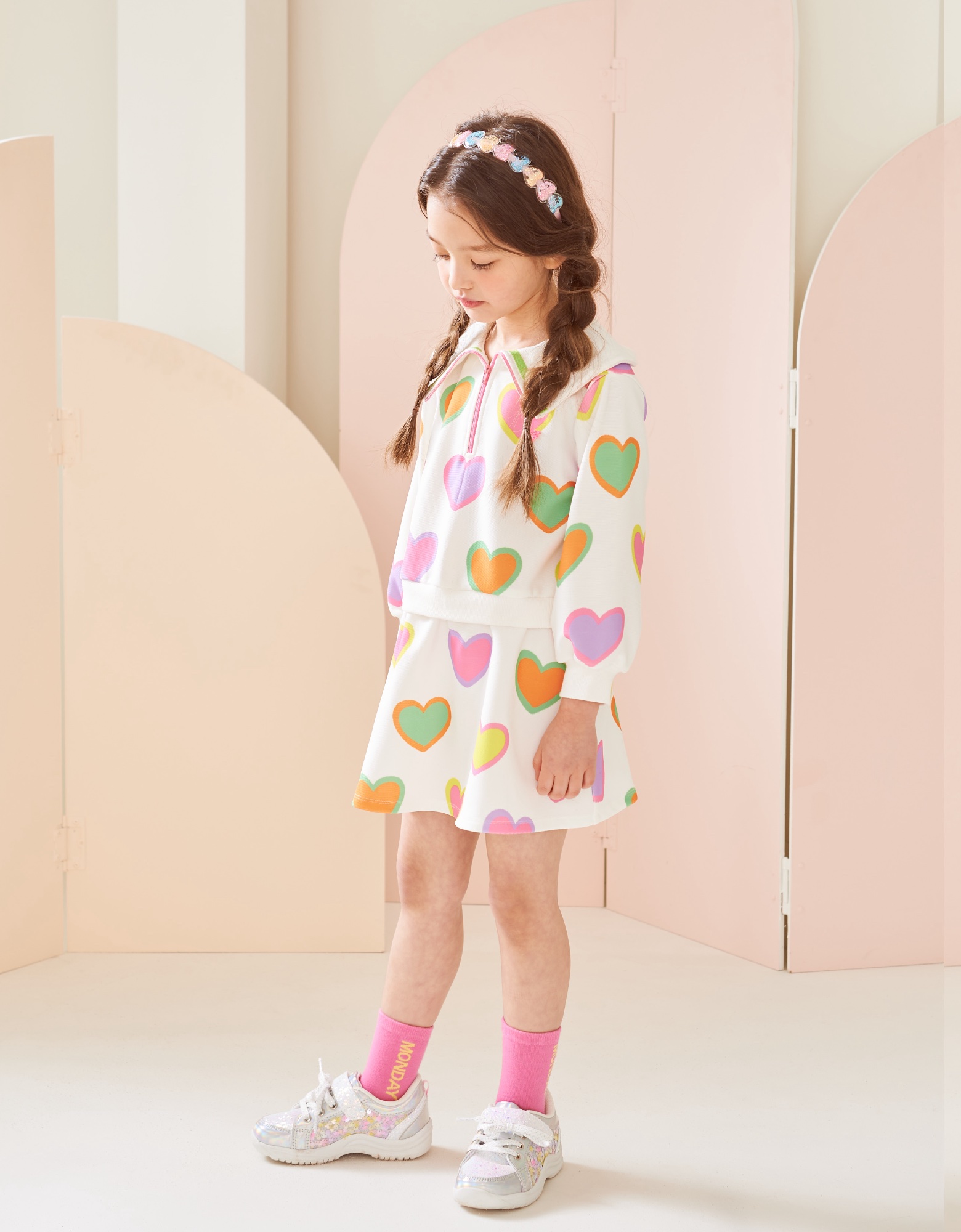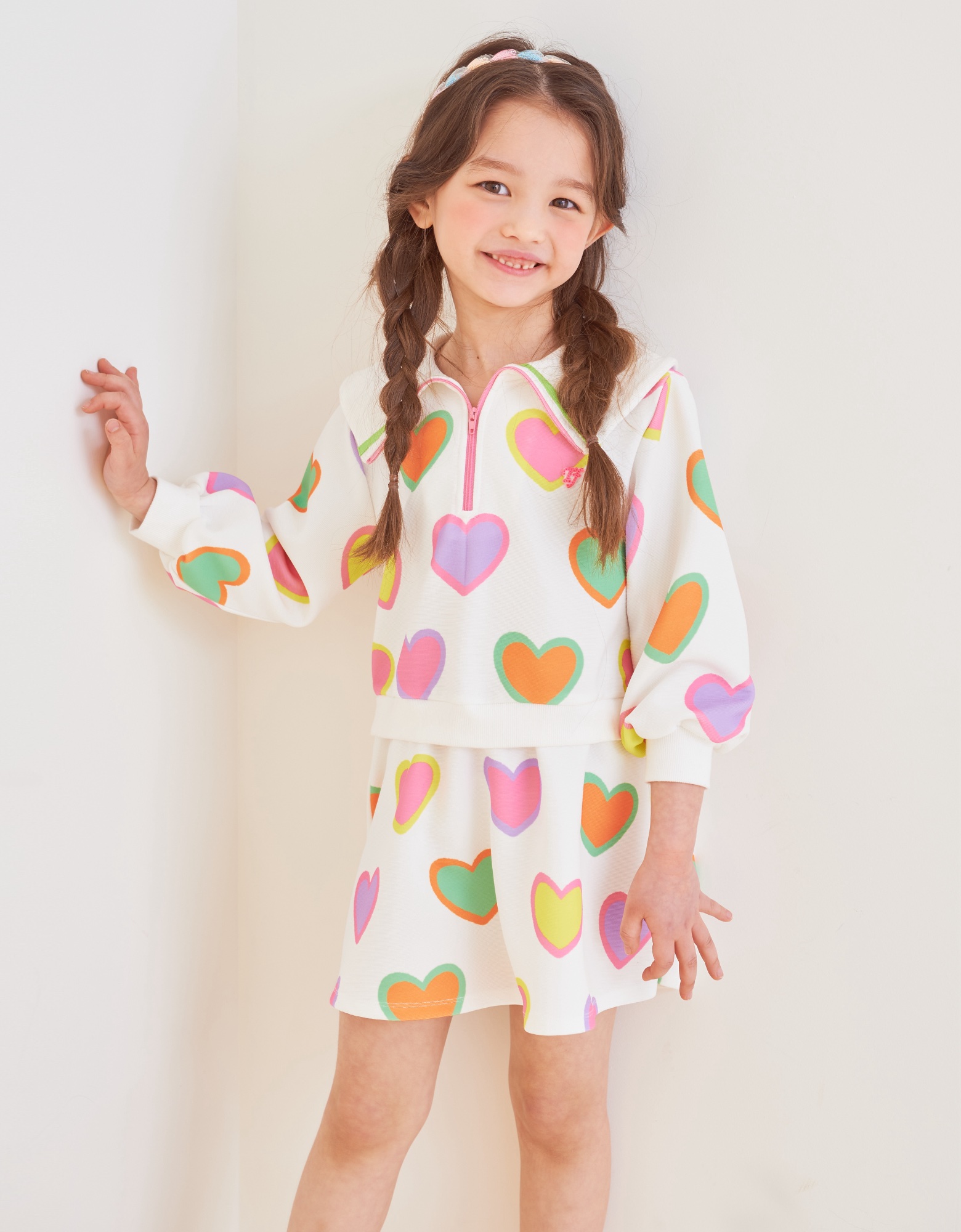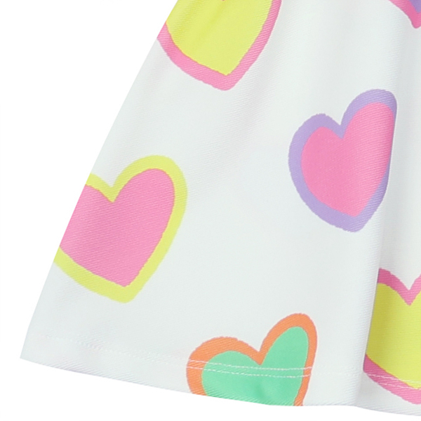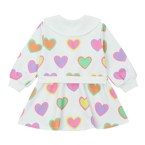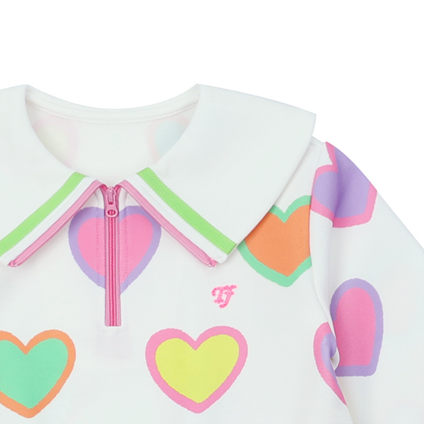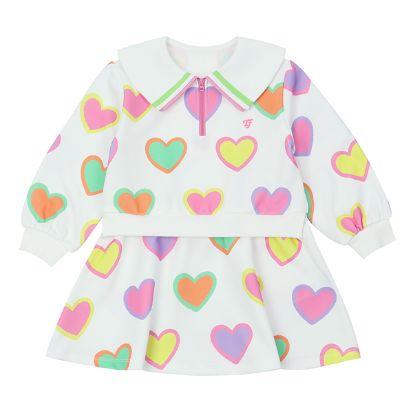 변형 가로 골지 소재에 컬러풀한 하트 프린트로 포인트를 준 집업 카라티 스타일의 원피스입니다. 앞지퍼 전체를 핑크 컬러로 배색 포인트를 주고 카라에 테잎 장식으로 컬러감을 살린 스타일로 허리에 립단을 주어 레이어드 스타일로 보이는 원피스 스타일입니다.
