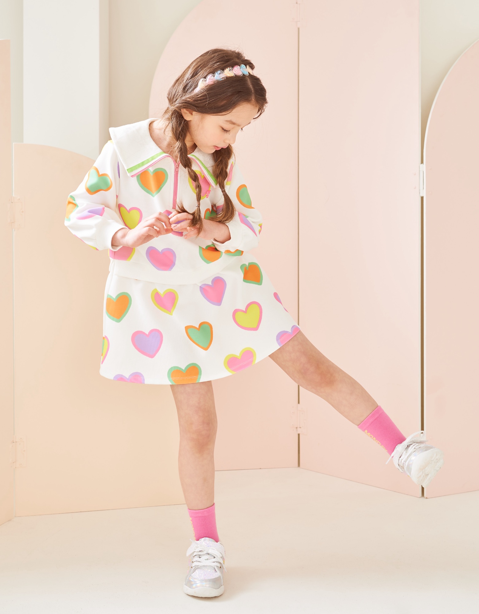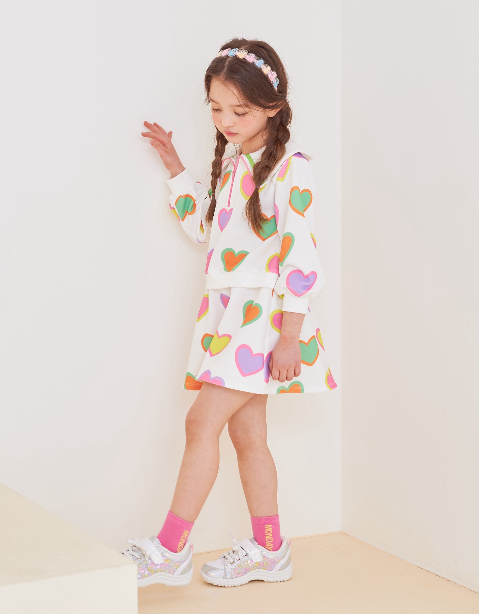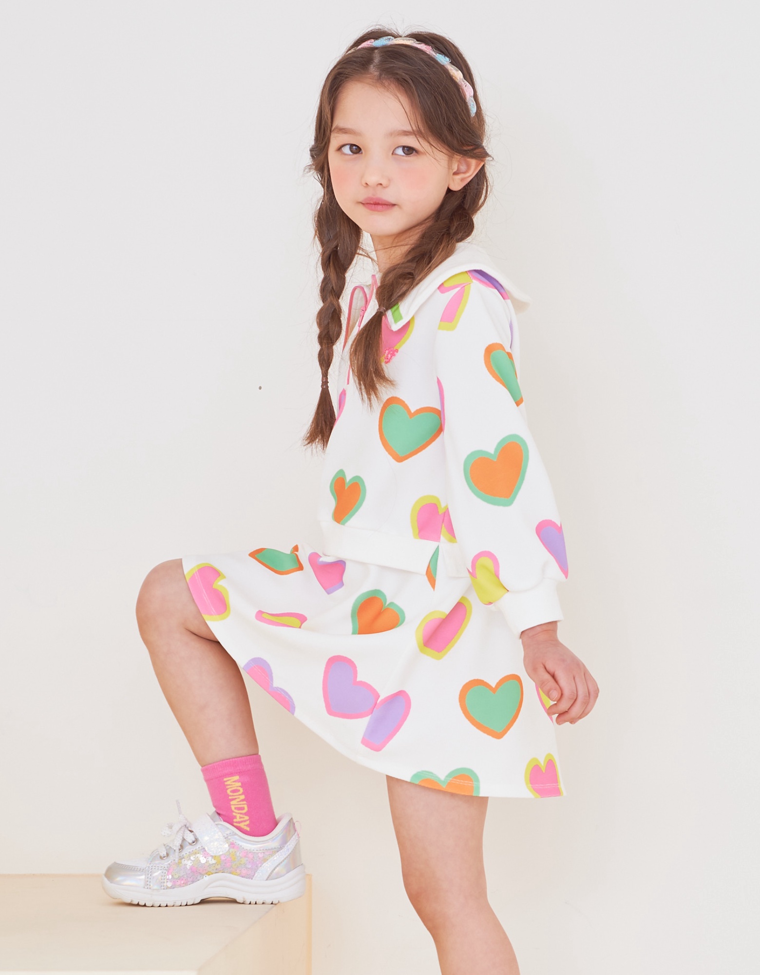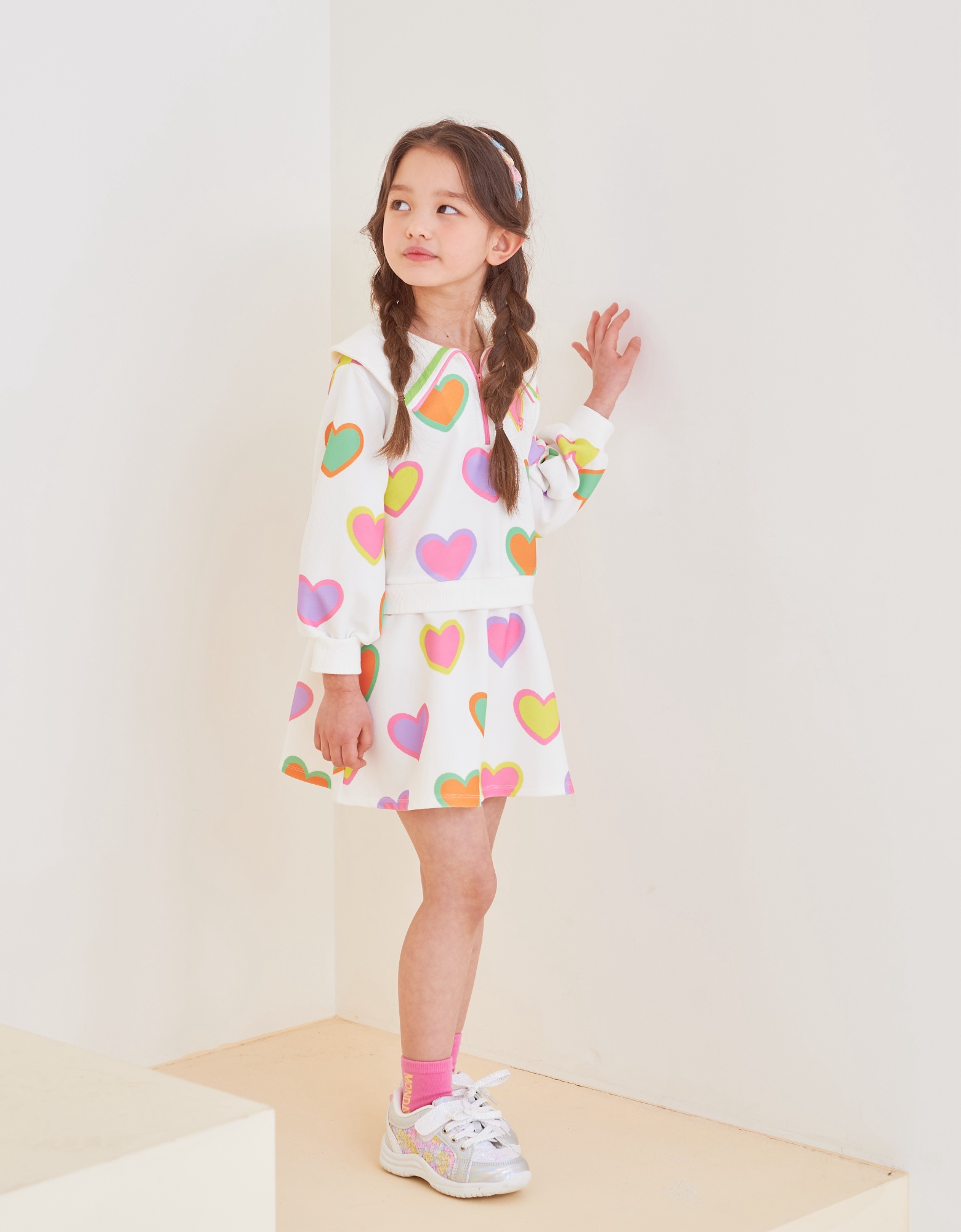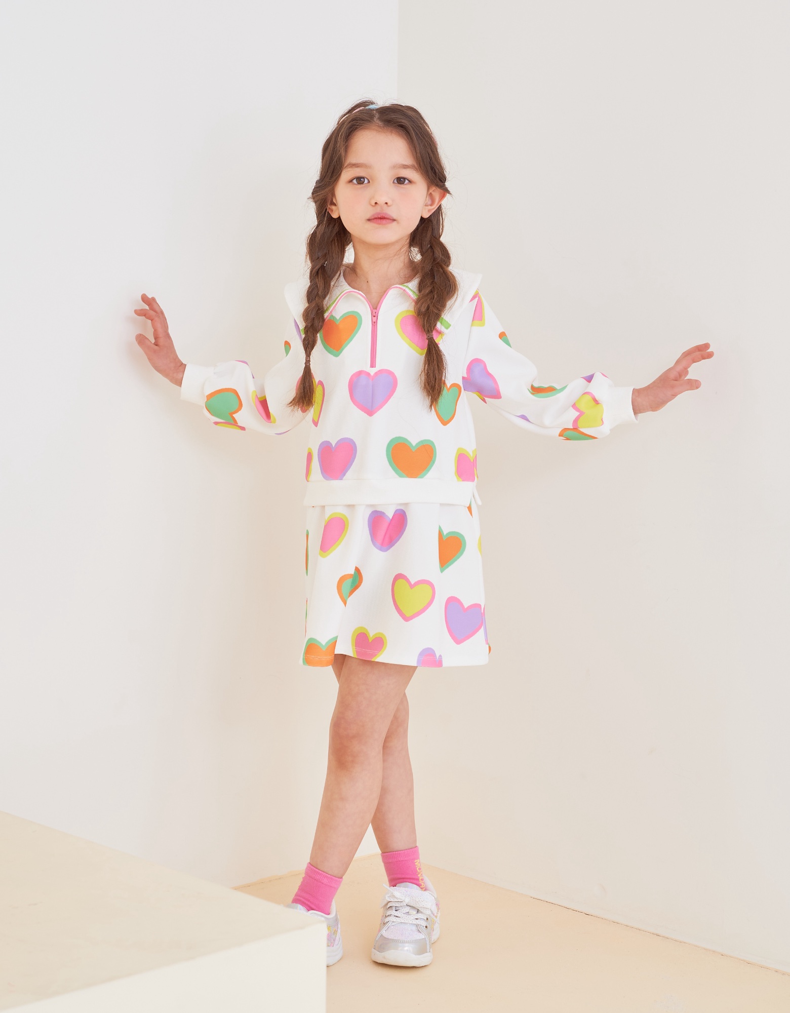 변형 가로 골지 소재에 컬러풀한 하트 프린트로 포인트를 준 집업 카라티 스타일의 원피스입니다. 앞지퍼 전체를 핑크 컬러로 배색 포인트를 주고 카라에 테잎 장식으로 컬러감을 살린 스타일로 허리에 립단을 주어 레이어드 스타일로 보이는 원피스 스타일입니다.