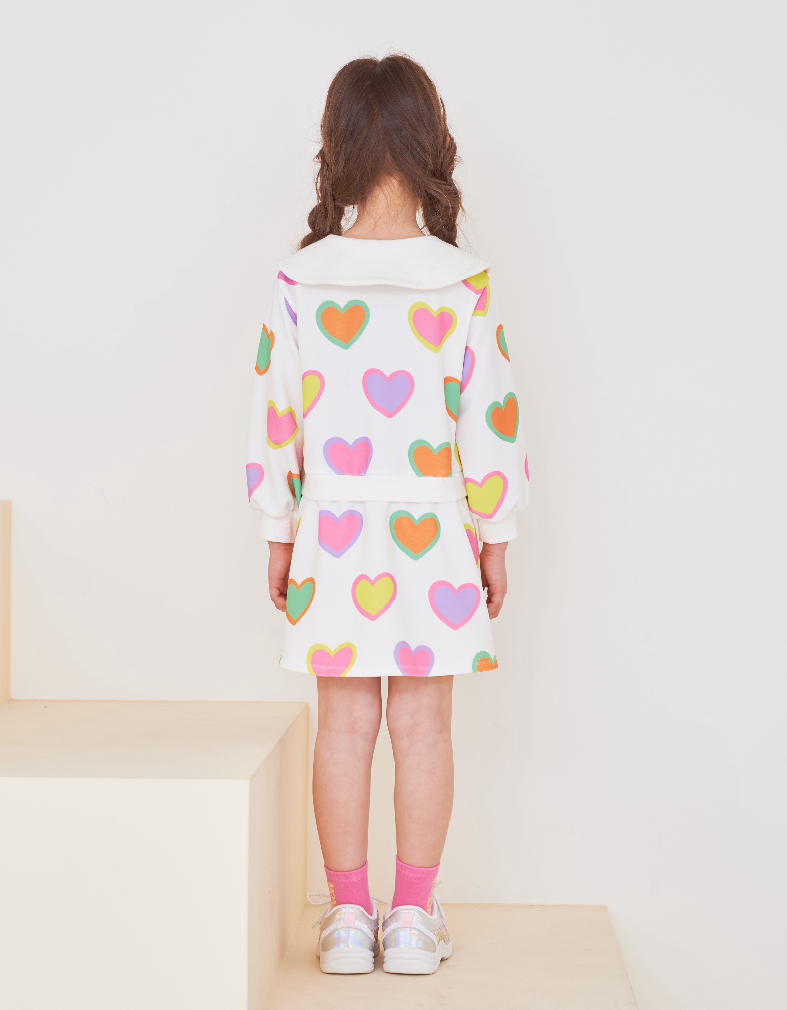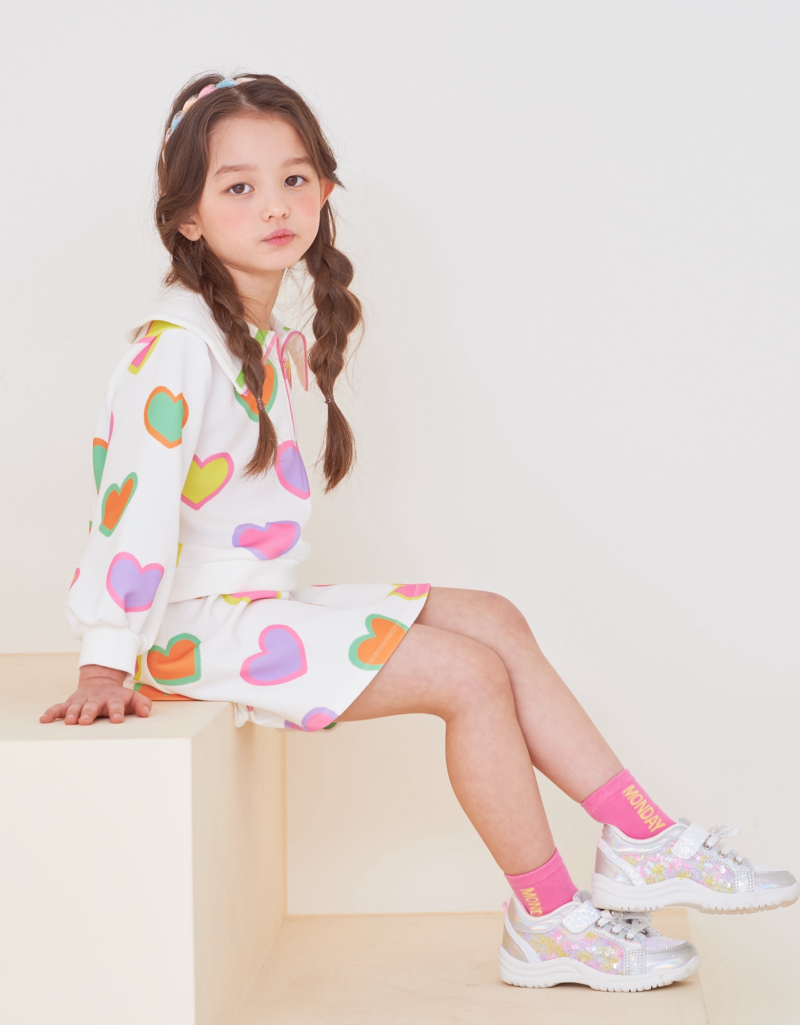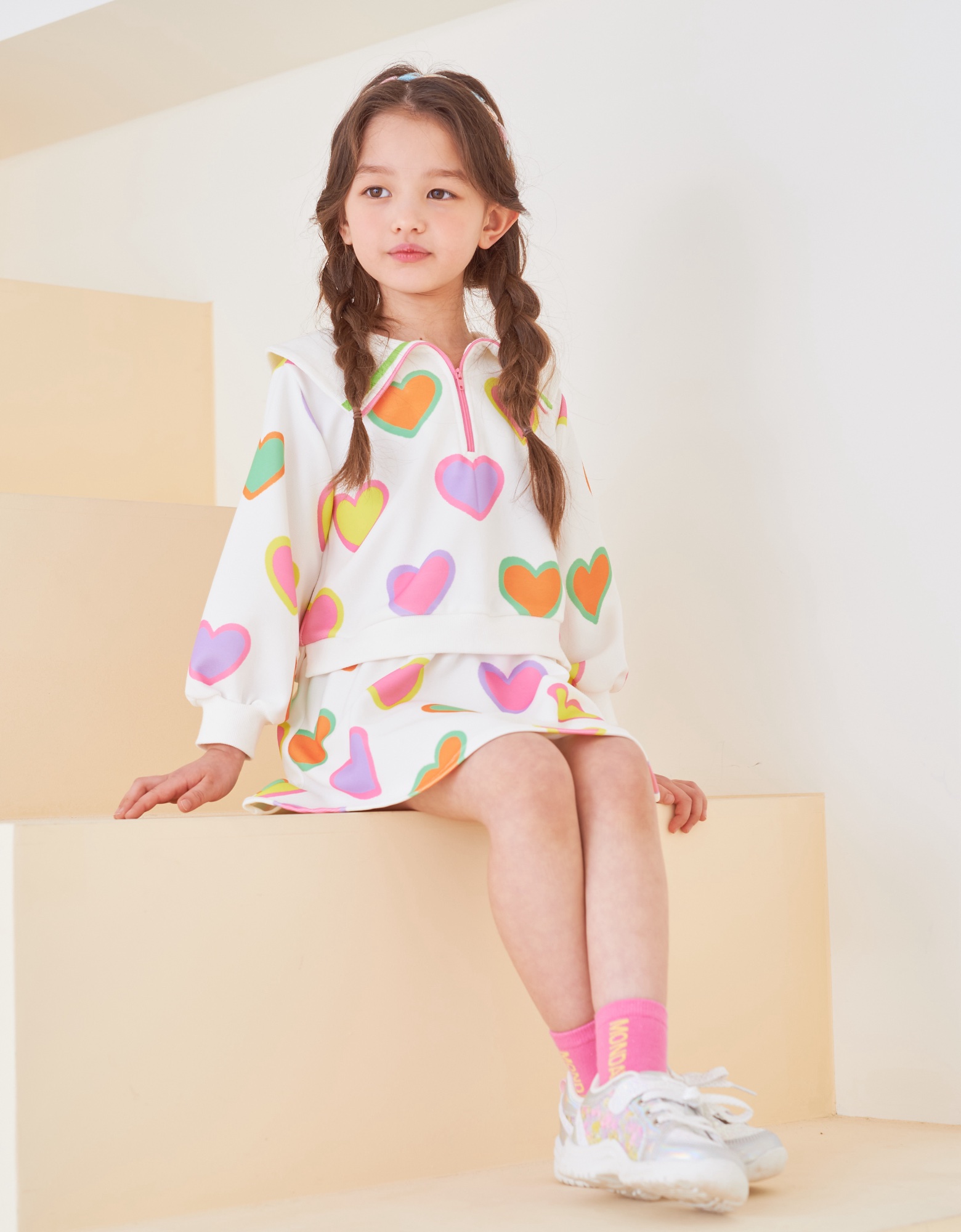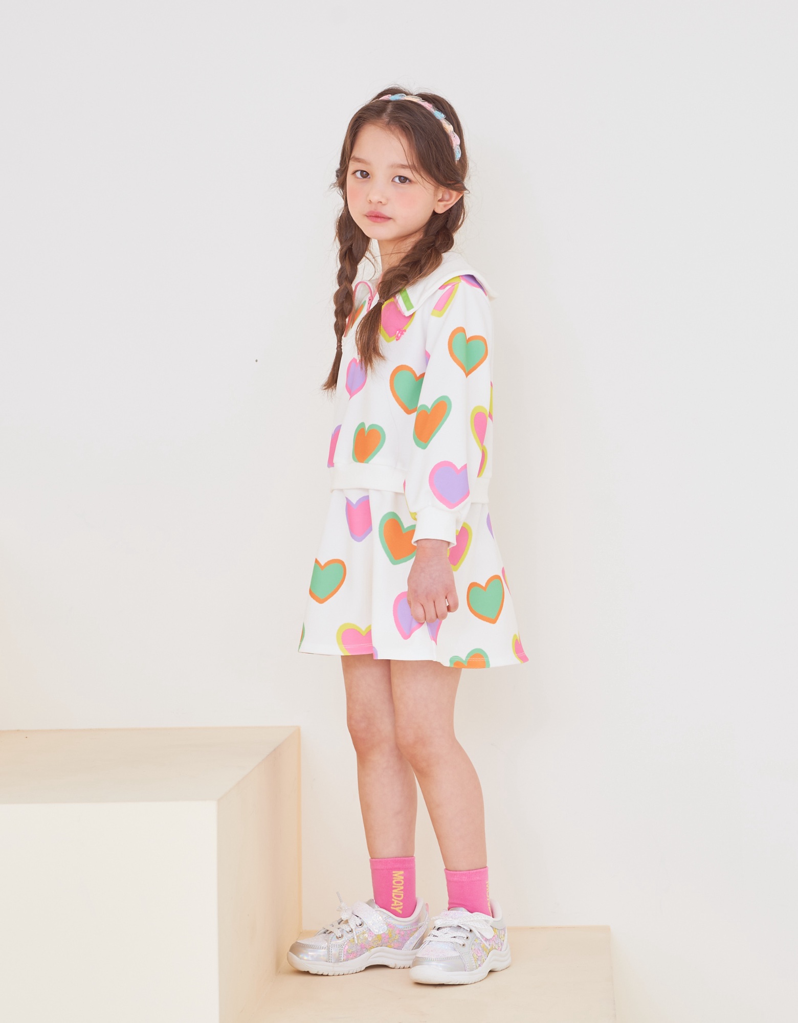 변형 가로 골지 소재에 컬러풀한 하트 프린트로 포인트를 준 집업 카라티 스타일의 원피스입니다. 앞지퍼 전체를 핑크 컬러로 배색 포인트를 주고 카라에 테잎 장식으로 컬러감을 살린 스타일로 허리에 립단을 주어 레이어드 스타일로 보이는 원피스 스타일입니다.