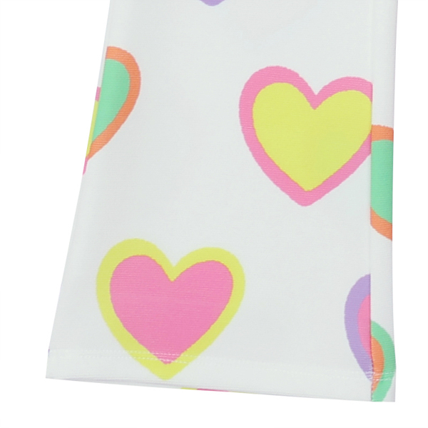 변형 가로 골지 소재에 컬러풀한 하트 프린트로 포인트를 준 부츠컷 팬츠입니다. 상의 반집업 카라티와 셋트로 코디하여 연출하기 좋은 스타일입니다.