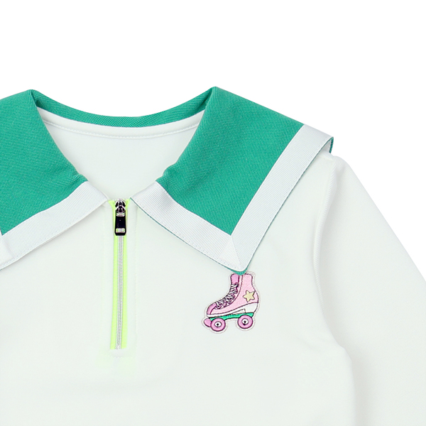 아이보리 컬러의 카라집업티로 카라끝에 테이프 배색으로 컬러포인트를 주었고 PK주름큐롯팬츠나 IV주름스커트와 같이 코디하실수있는 아이템입니다.