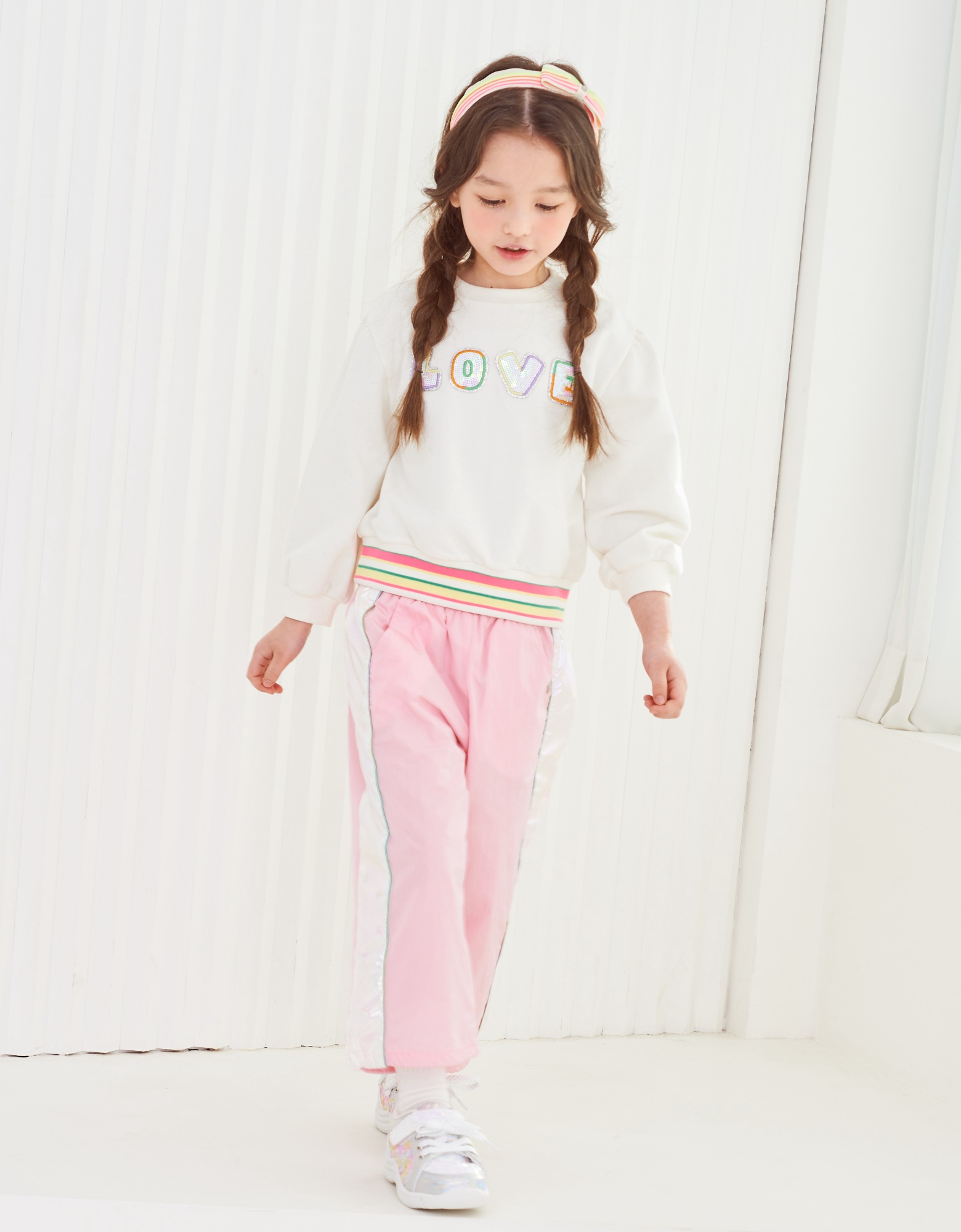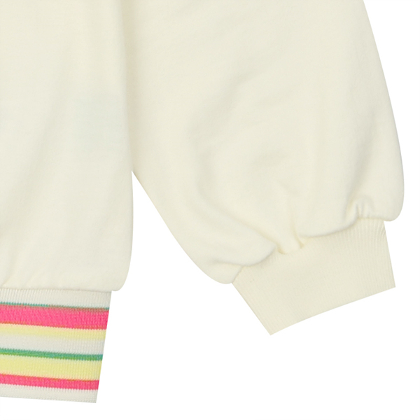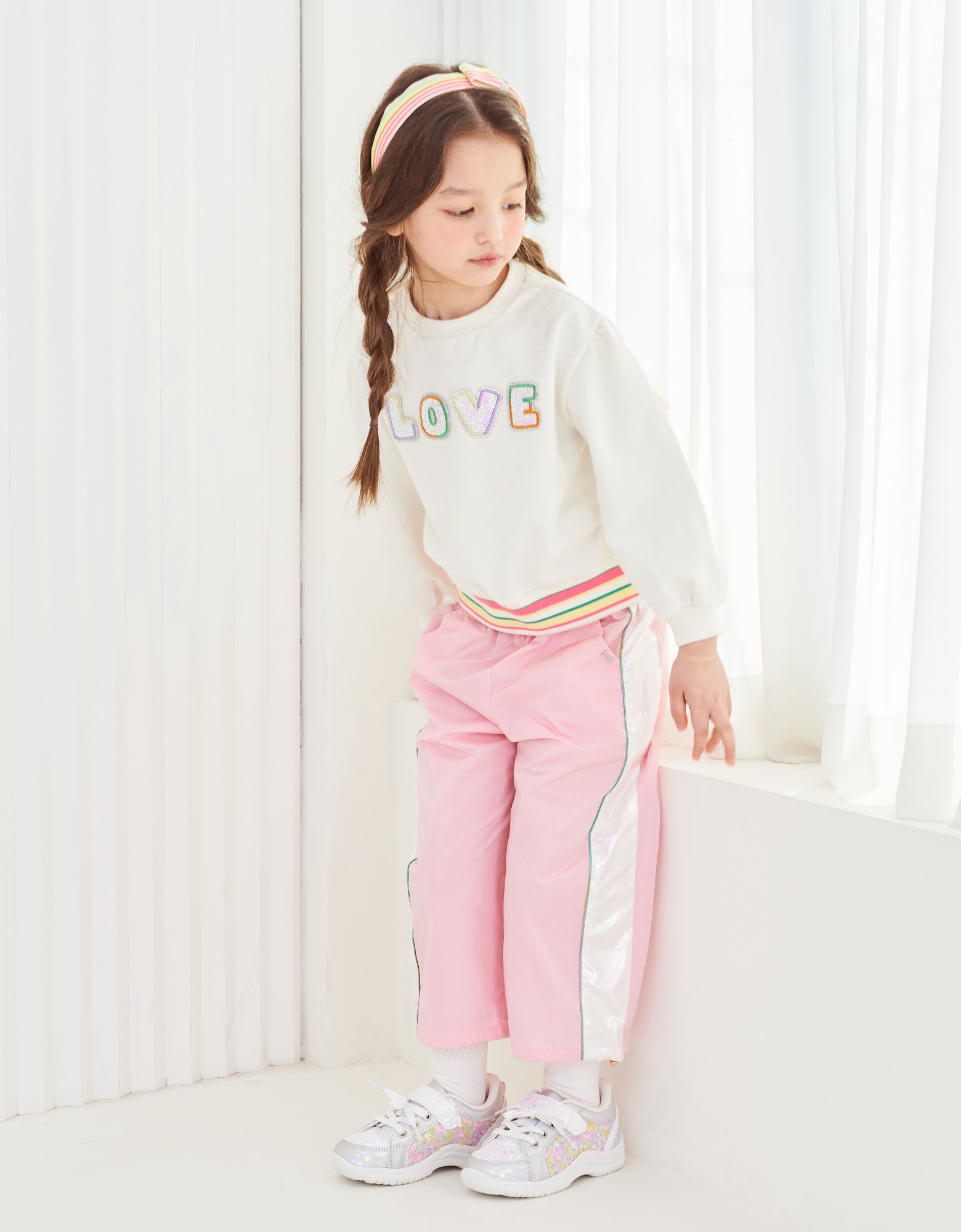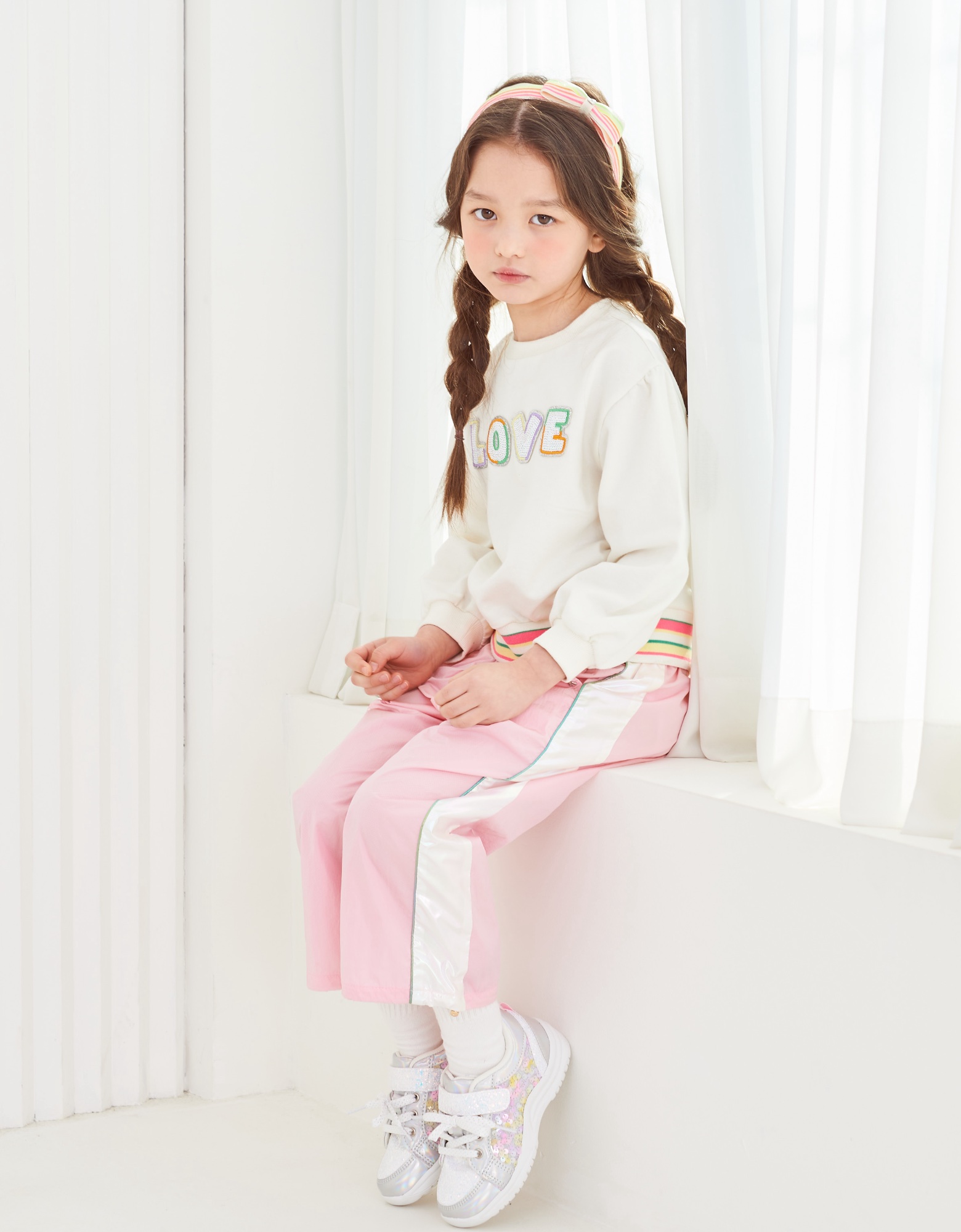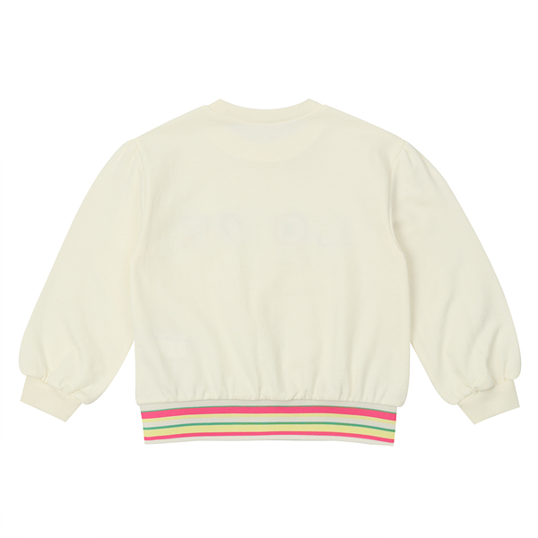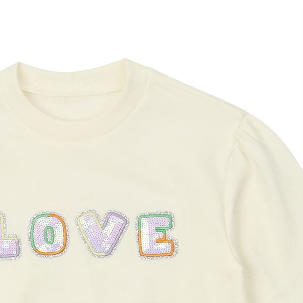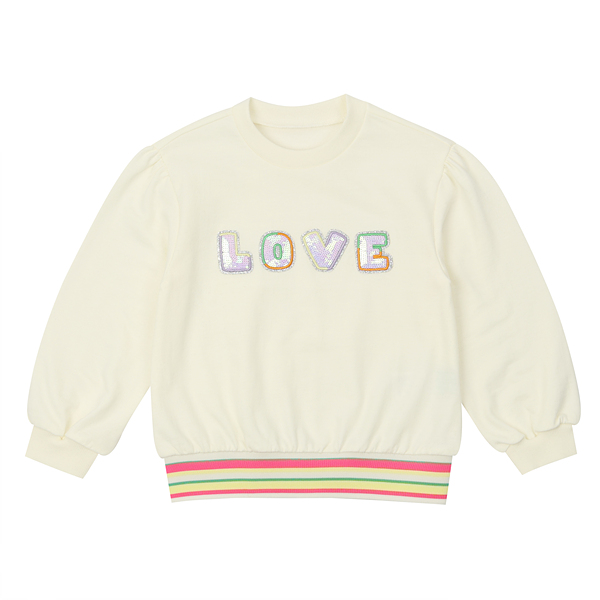 깔끔한 아이보리 맨투맨으로 밑단에 컬러감있는 시보리와 가슴에 블링한 러브스팽글자수가 포인트인 아이템으로 데님팬츠나 큐롯과같이 코디하실수 있는 아이템
