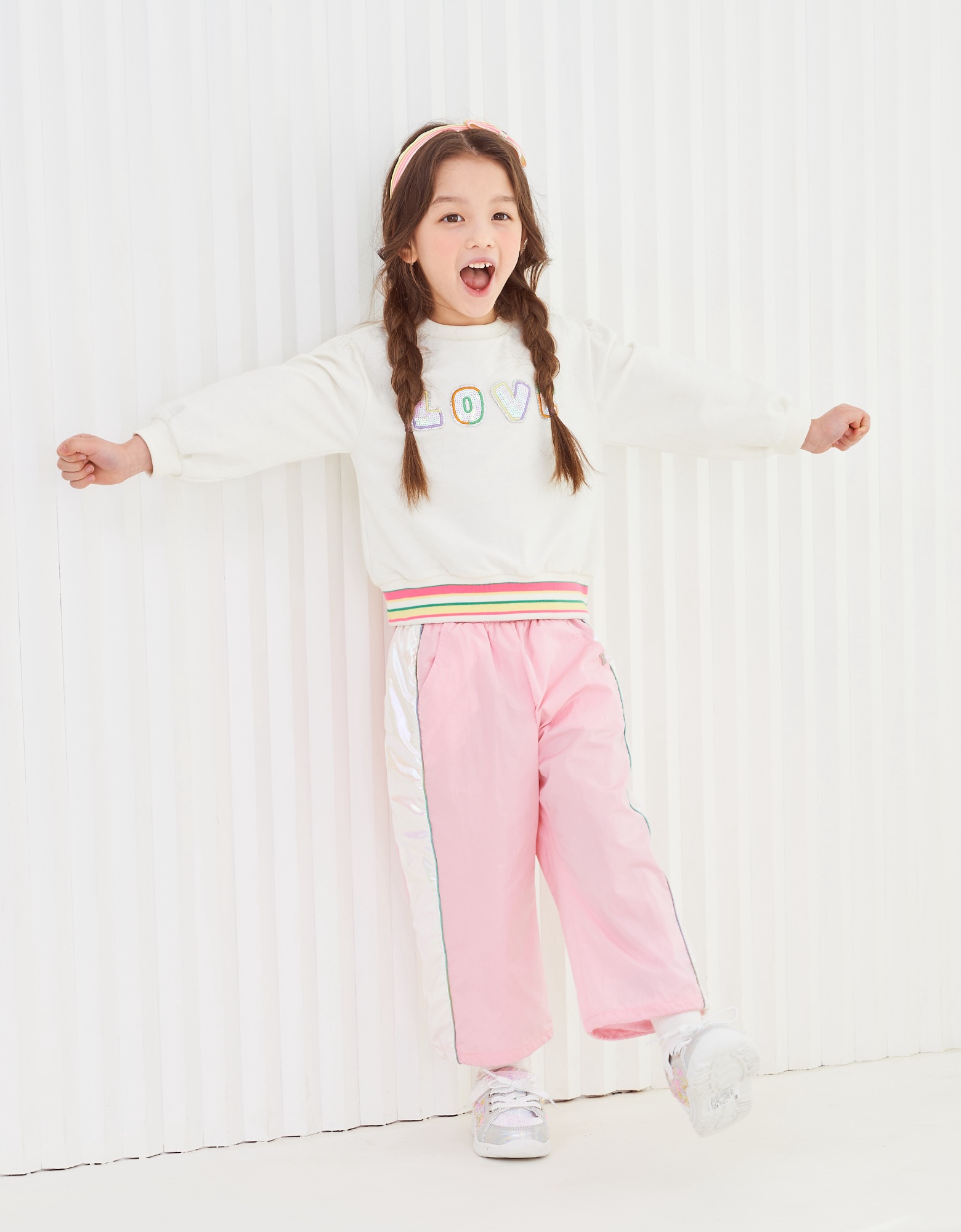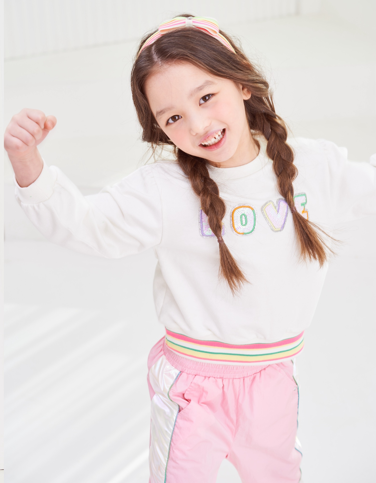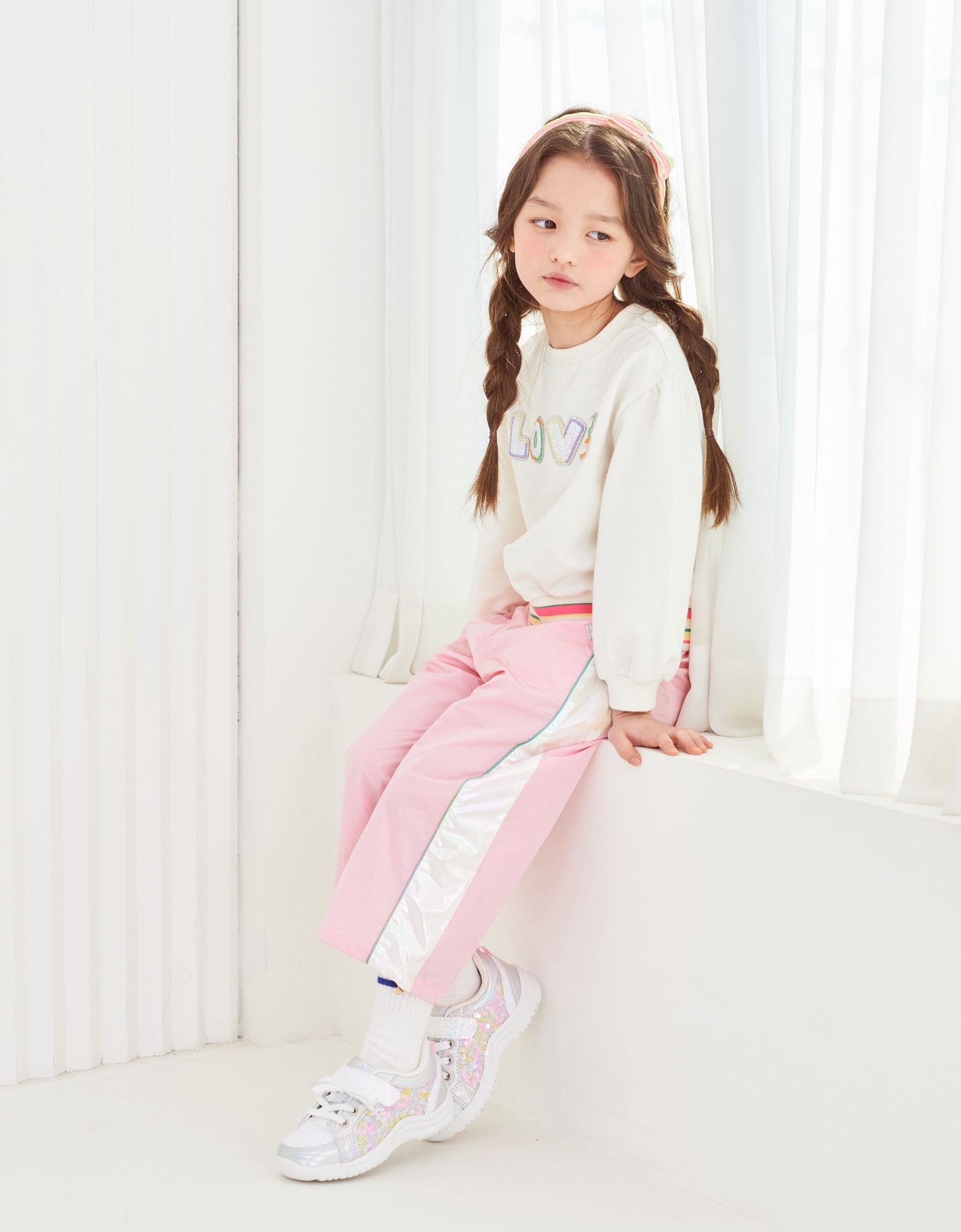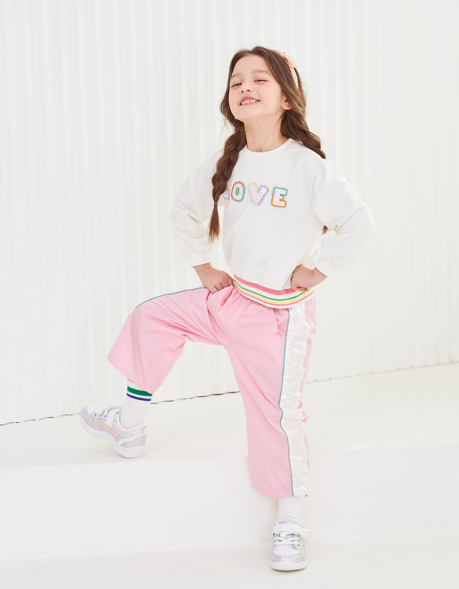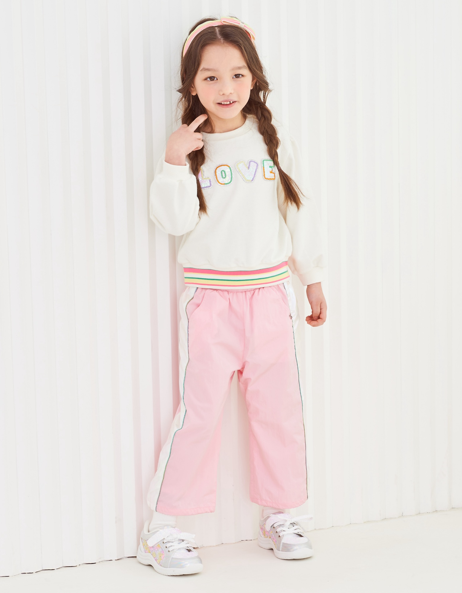 깔끔한 아이보리 맨투맨으로 밑단에 컬러감있는 시보리와 가슴에 블링한 러브스팽글자수가 포인트인 아이템으로 데님팬츠나 큐롯과같이 코디하실수 있는 아이템