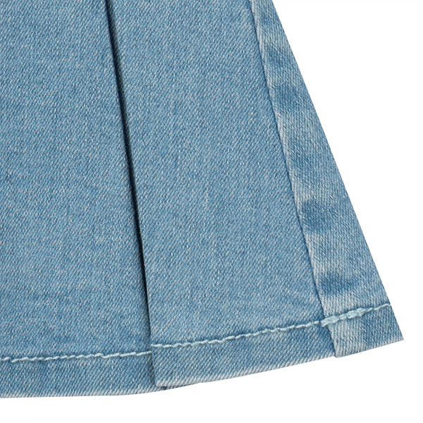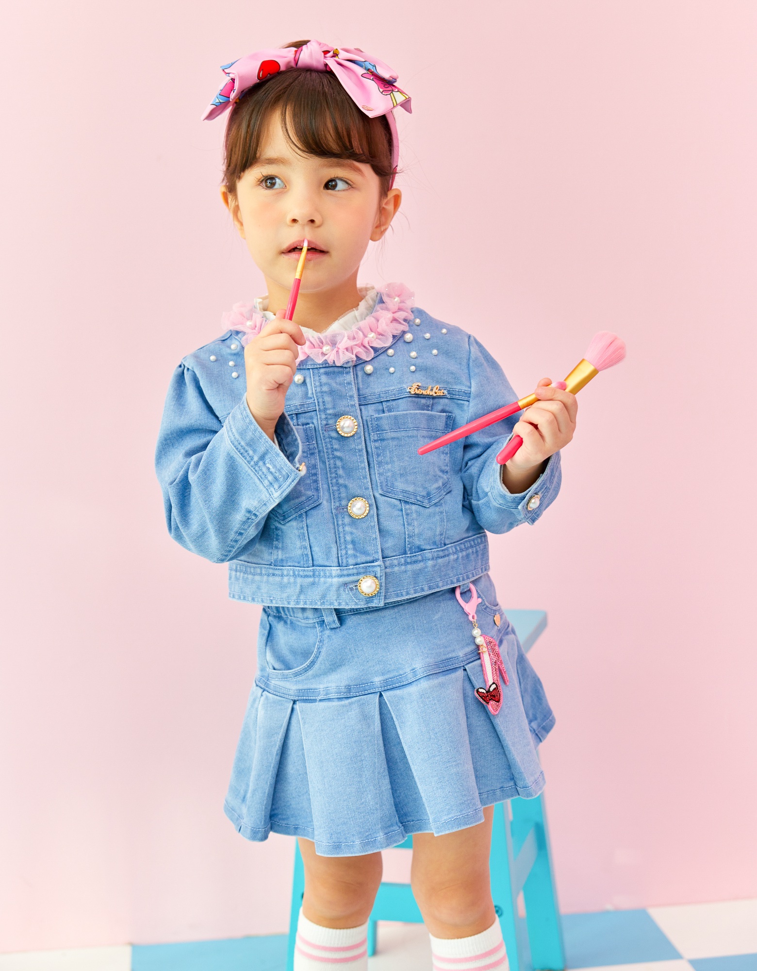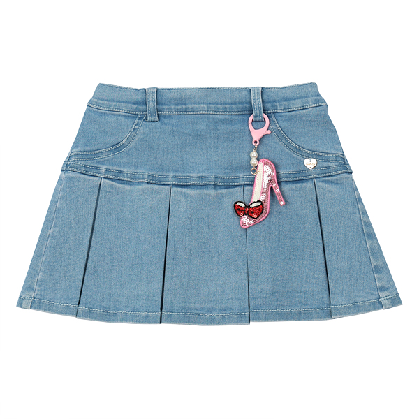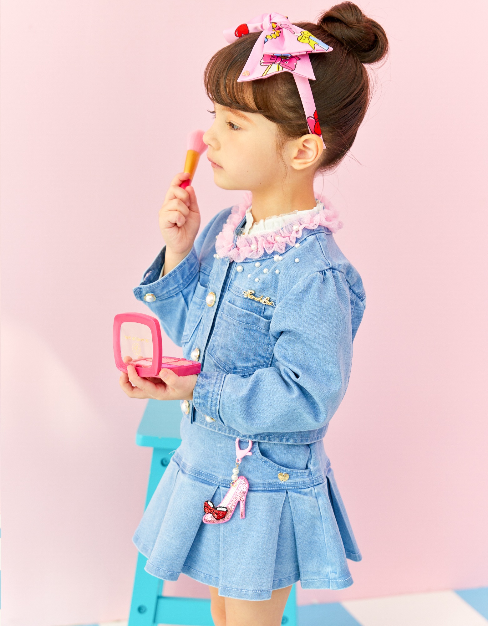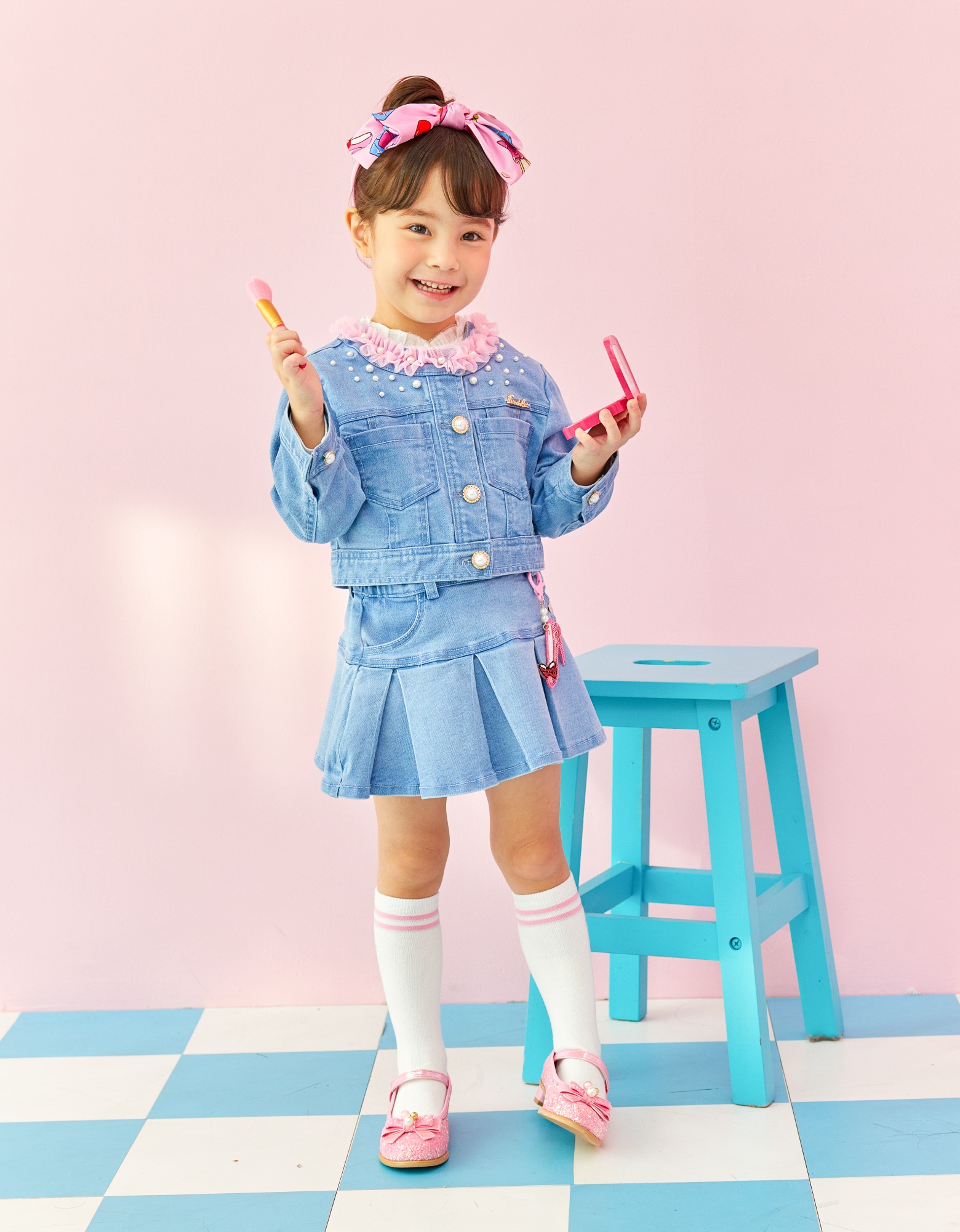 밝게 워싱된 신축성 좋은 원단의 데님으로 만든 스커트로 주름이 크게크게 들어가있어서 움직일 때 모양이 예쁜 제품입니다. 탈착 가능한 블링블링한 구두 와펜이 포인트가 되는 제품으로 PK 프린트 TS등과 함께 러블리 캐주얼 코디를 완성해보세요.