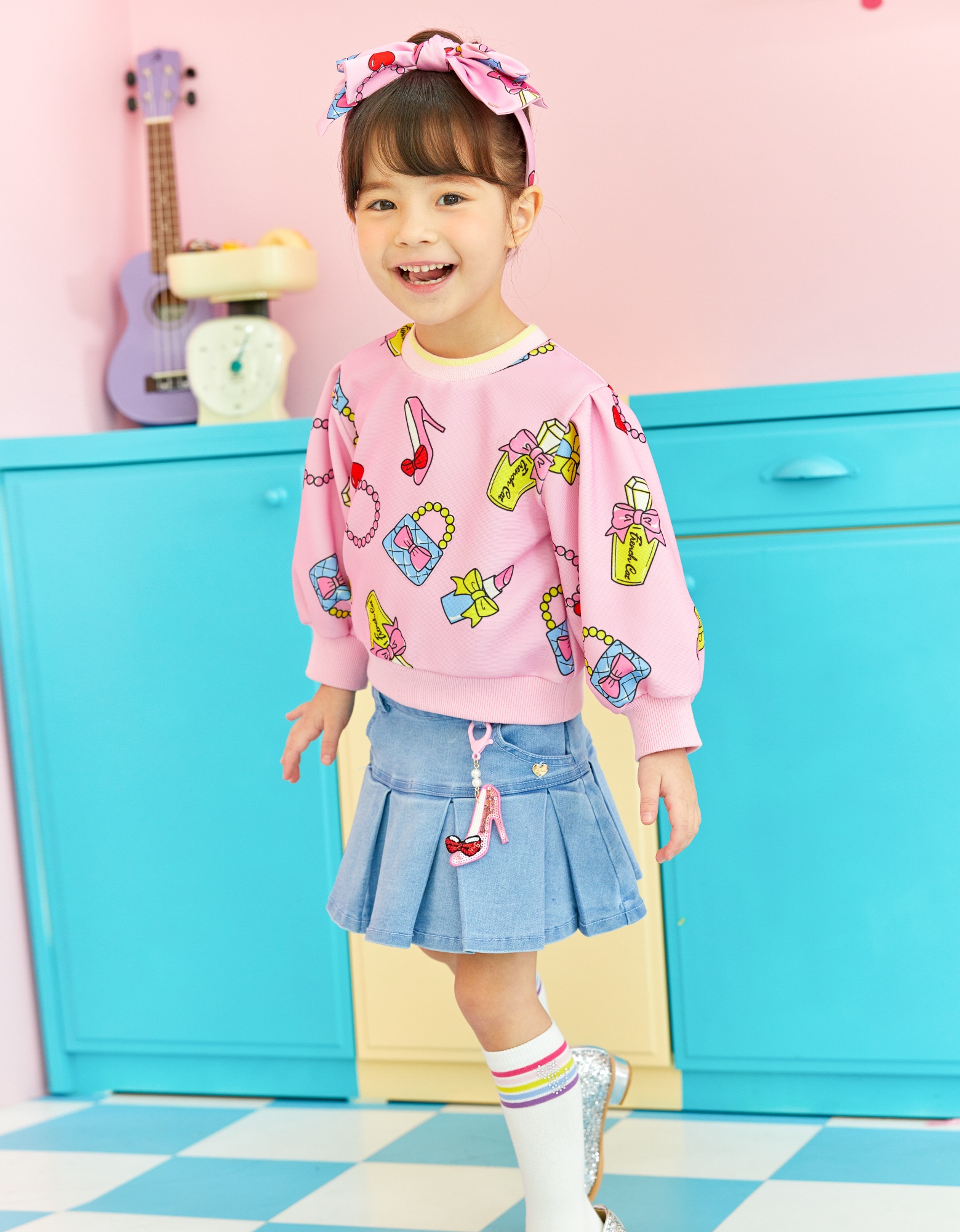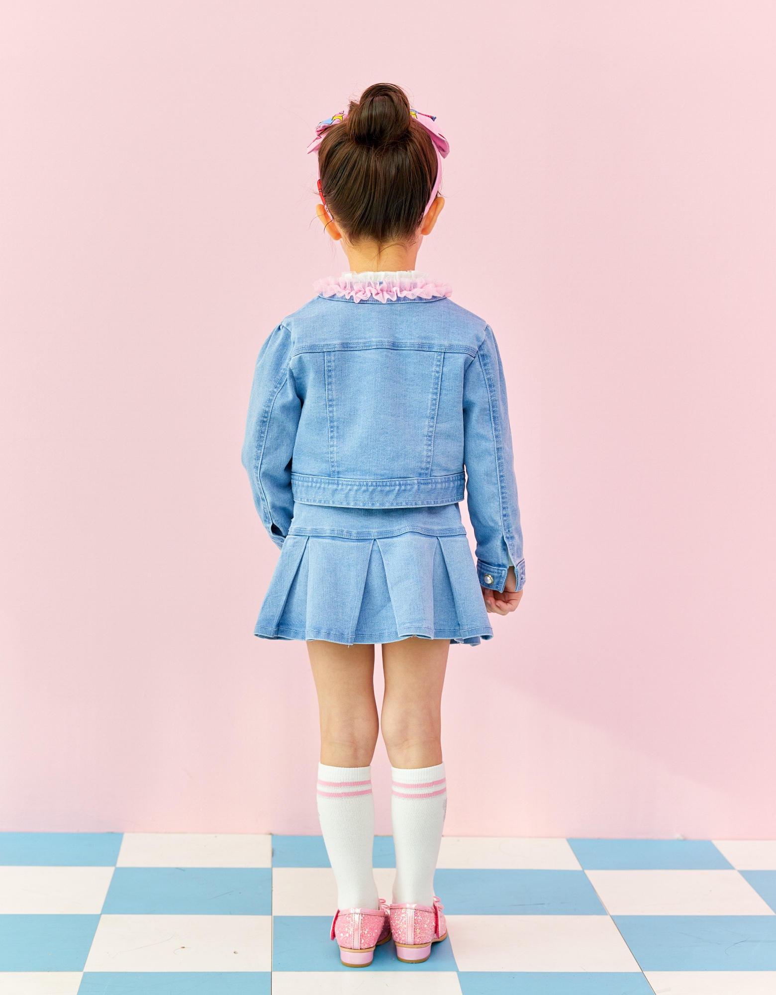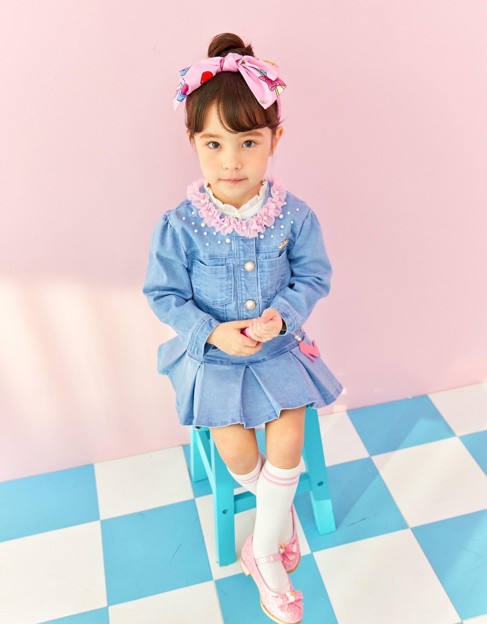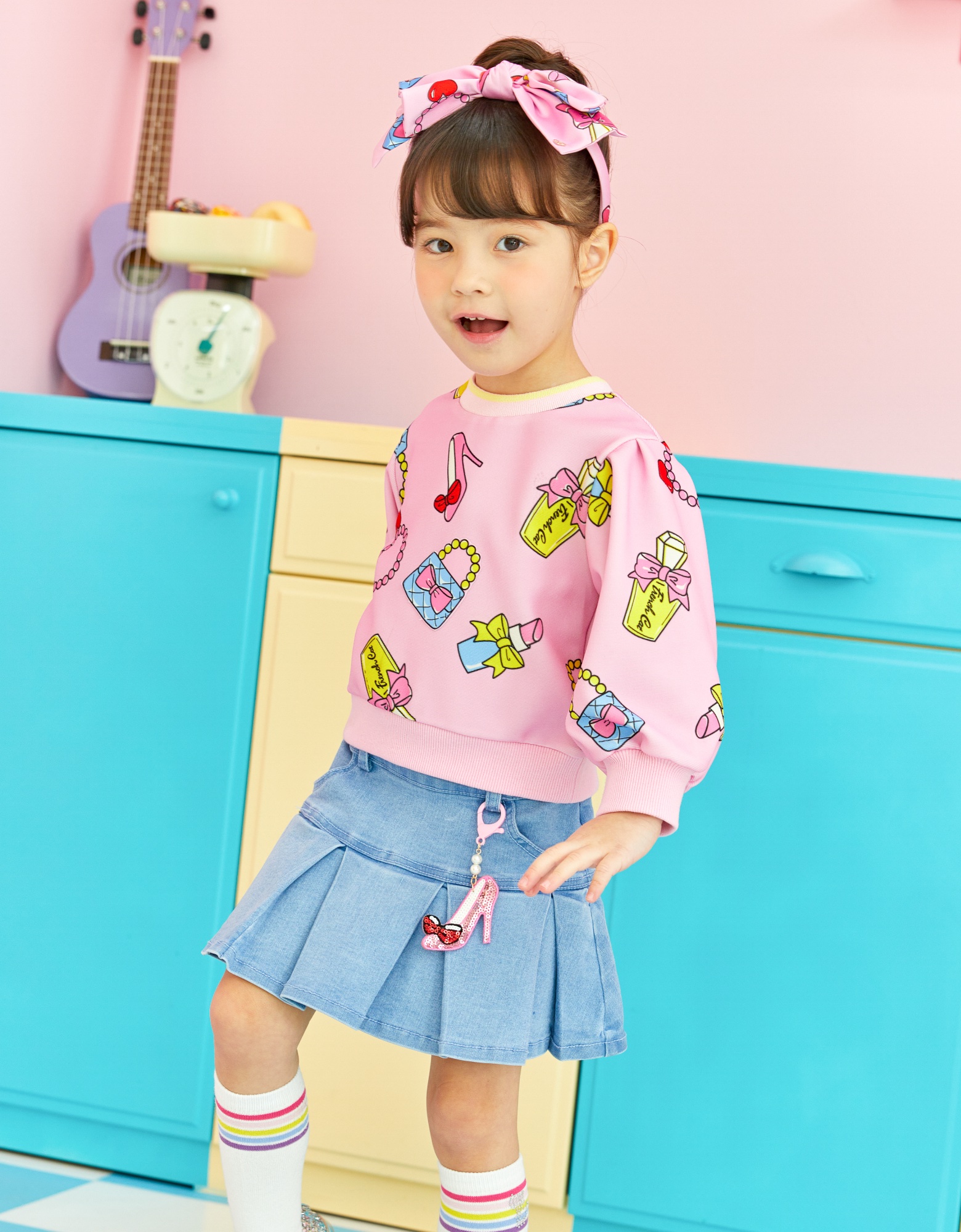 밝게 워싱된 신축성 좋은 원단의 데님으로 만든 스커트로 주름이 크게크게 들어가있어서 움직일 때 모양이 예쁜 제품입니다. 탈착 가능한 블링블링한 구두 와펜이 포인트가 되는 제품으로 PK 프린트 TS등과 함께 러블리 캐주얼 코디를 완성해보세요.