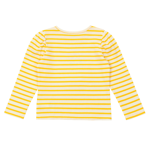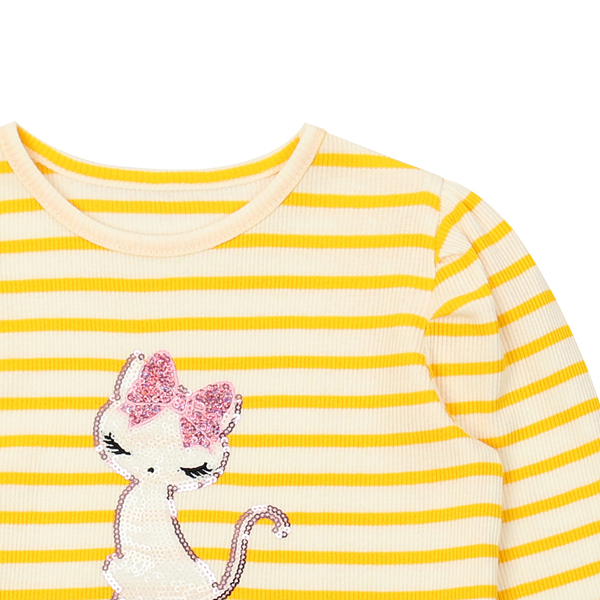 신축성 좋은 골지에 선명한 옐로우 스트라이프 원단으로 만든 티셔츠입니다. 볼륨있는 소매라인이 사랑스러운 전면에 블링한 시그니쳐 고양이가 포인트가 되는 제품입니다.