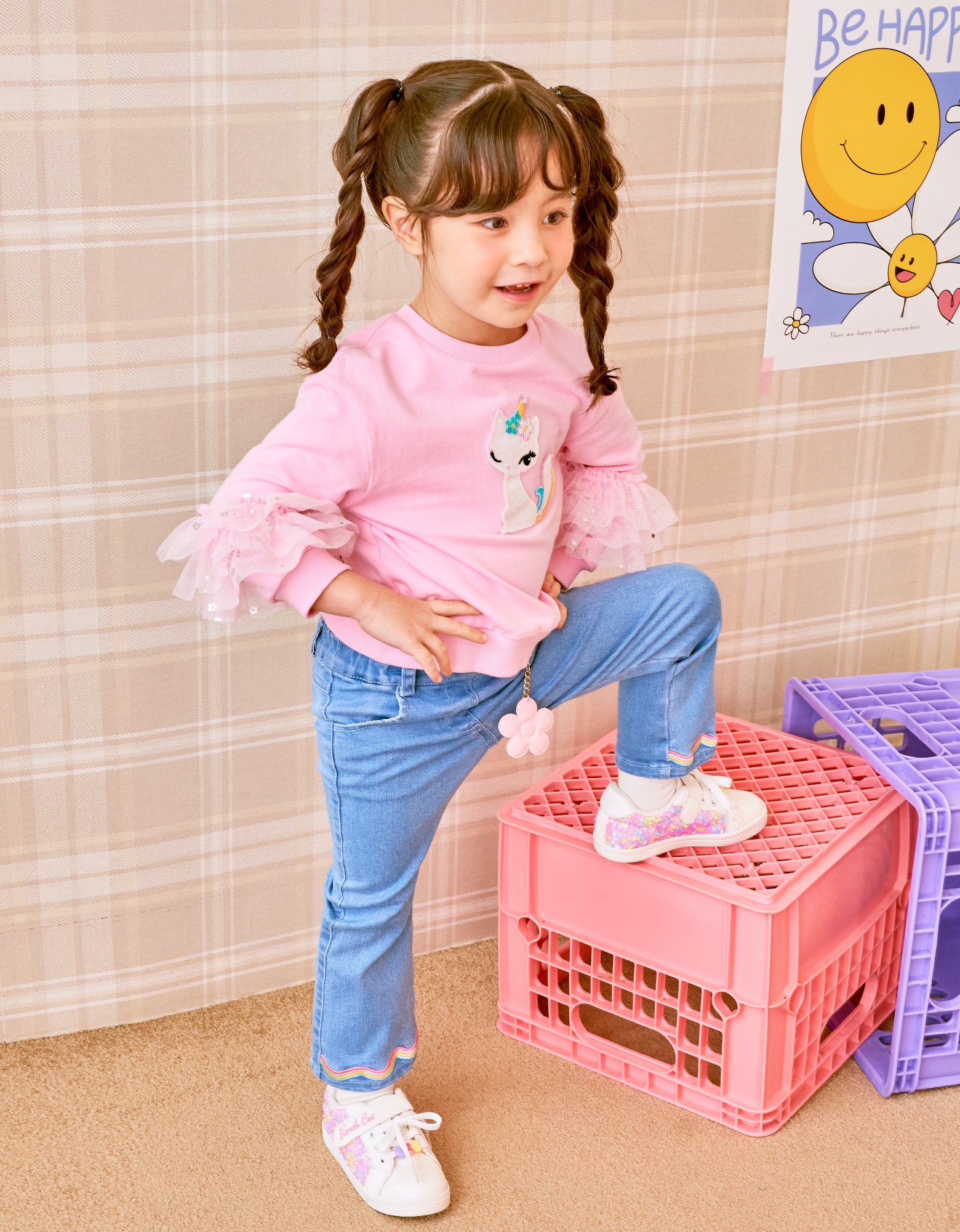 부리에는 무지개 칼라의자수가 스칼럽으로 놓여 있습니다.