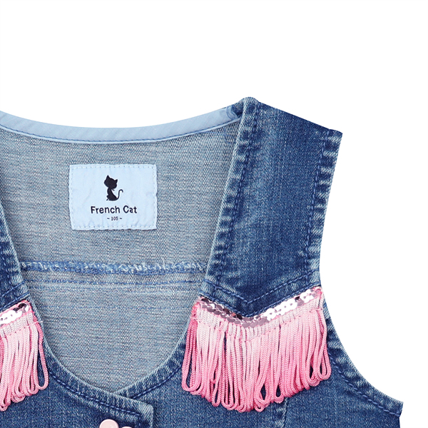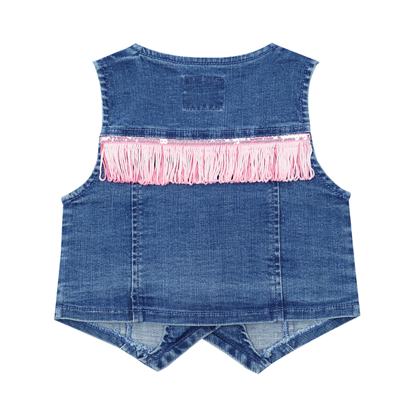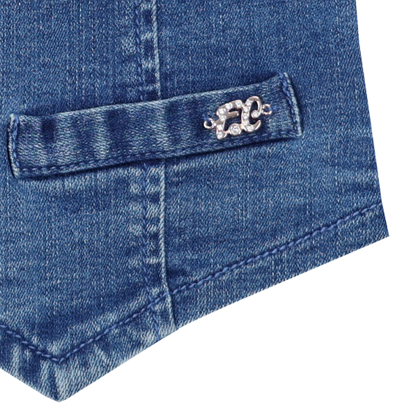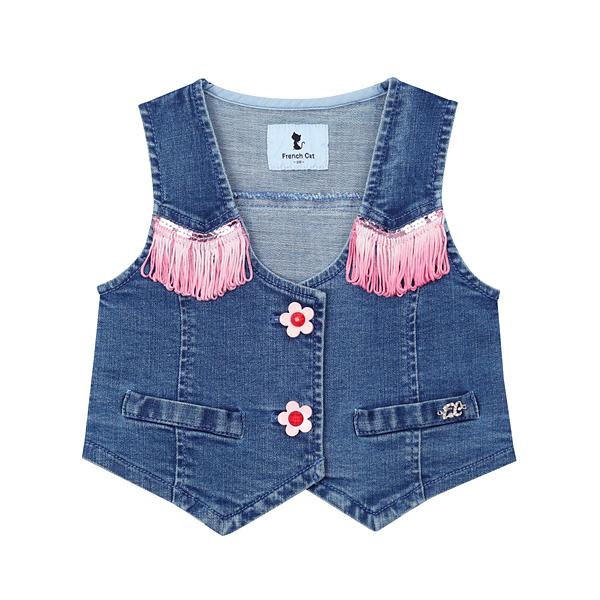 짧은 기장의 데님 조끼에 포인트로 꽃 브로치를 달아줘 귀여운 느낌을 살려준 디자인 입니다.