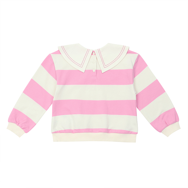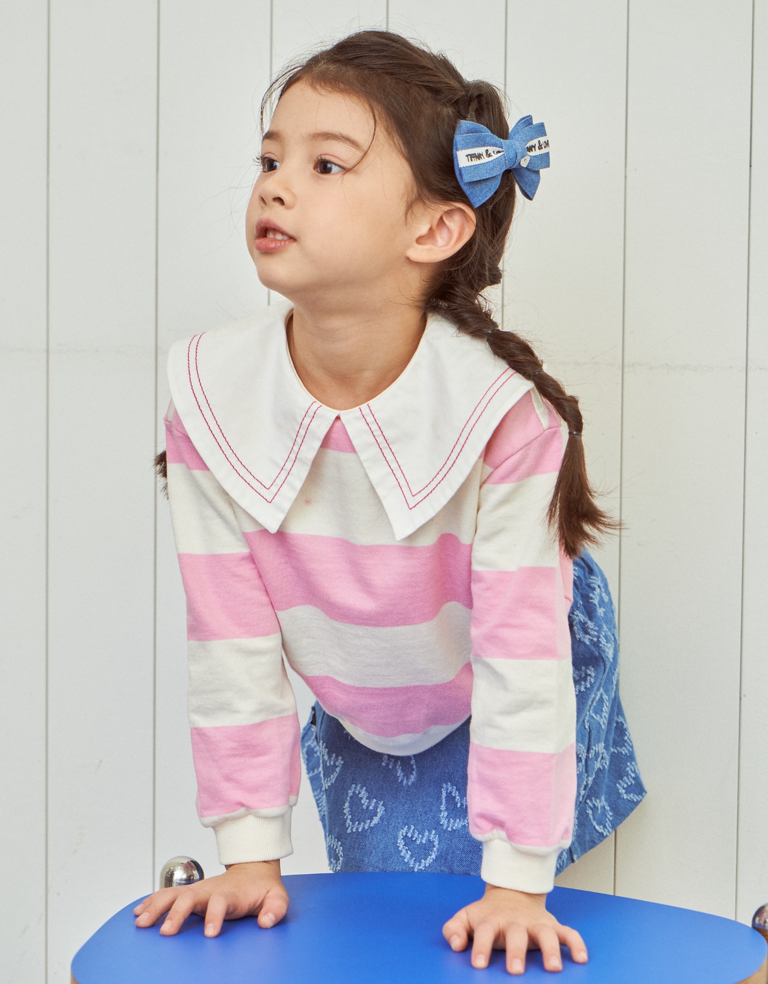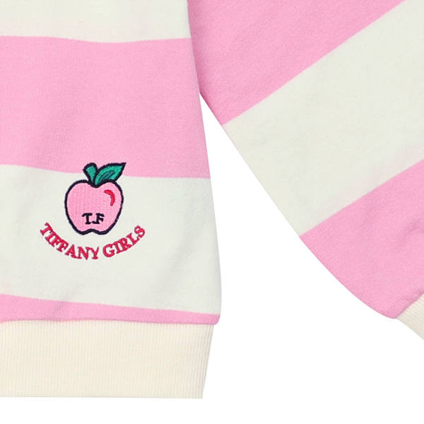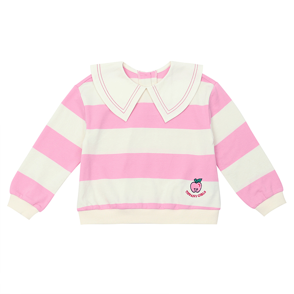 우븐 빅카라 스타일에 몸판은 스트라이프 다이마루를 사용하여 캐주얼하게 착용하기 좋은 티셔츠입니다. 컬러감있는 카라스티치와 사과자수가 귀여운 아이템입니다.