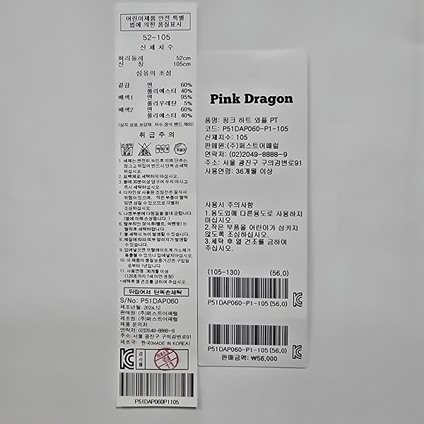 겉감 : 면 60 폴리에스터 40 배색 1 면 95 폴리우레탄 5 배색 2 면 60 폴리에스터 40 -