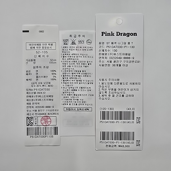 겉감 : 면 100 배색 1 면 95 폴리우레탄 5 배색 2 면100 -