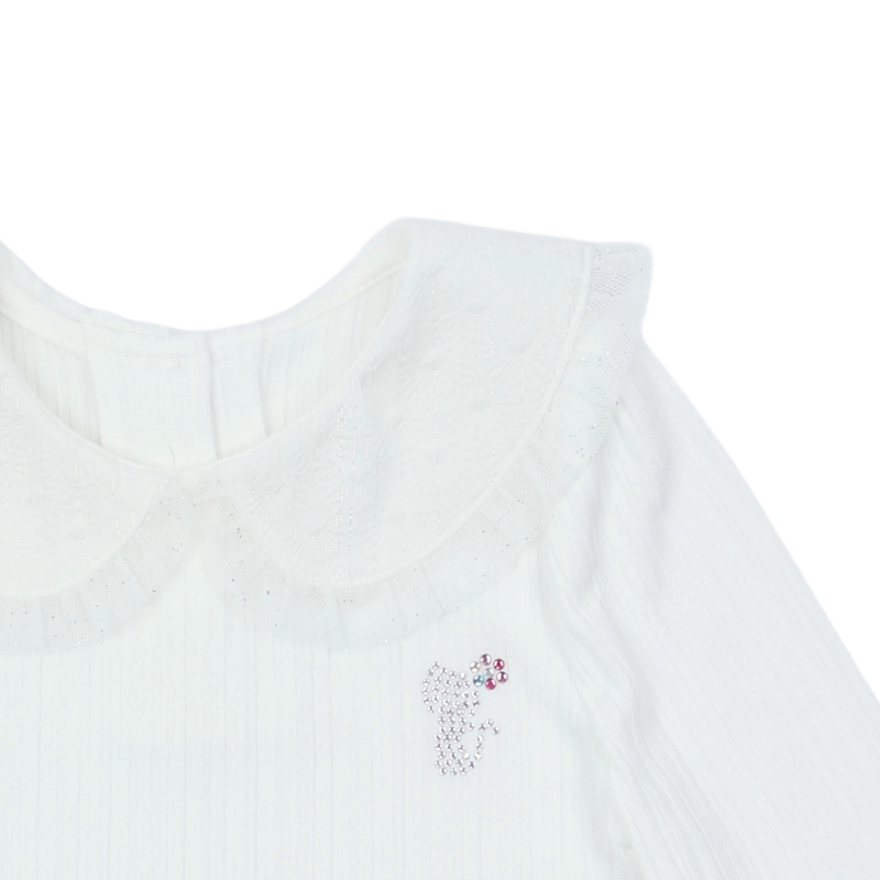 찰랑이고 신축성 좋은 골지 원단에 블링한 꽃자가드 원단에 샤프릴이 달린 카라가 포인트가 되는 제품입니다. 단품으로도 깔끔하고 고급스럽게 연출하기 좋은 아이템이 될 것입니다.