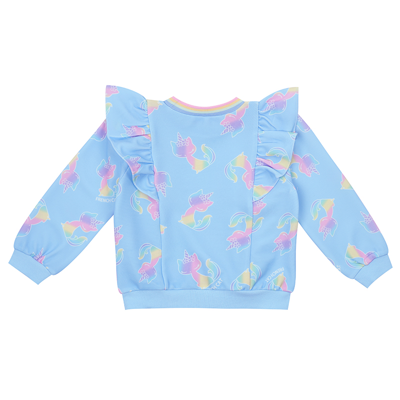 맑은 블루 바닥에 무지개 칼라의 프캣 고양이가 프린트로 있는 져지 MTM 입니다.