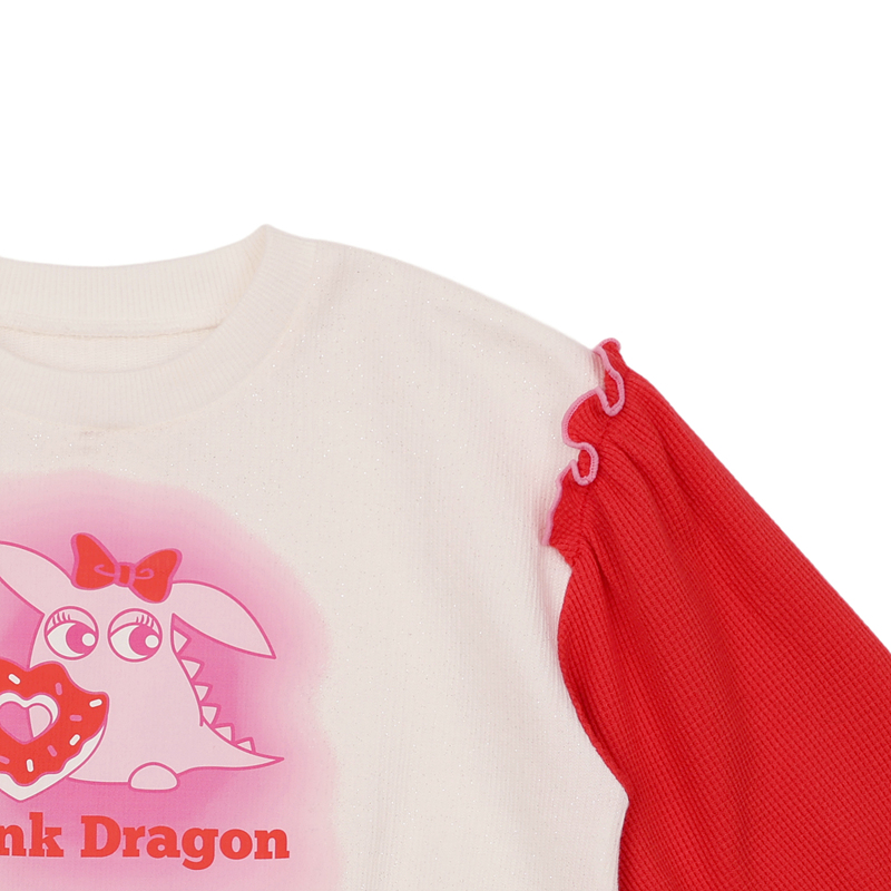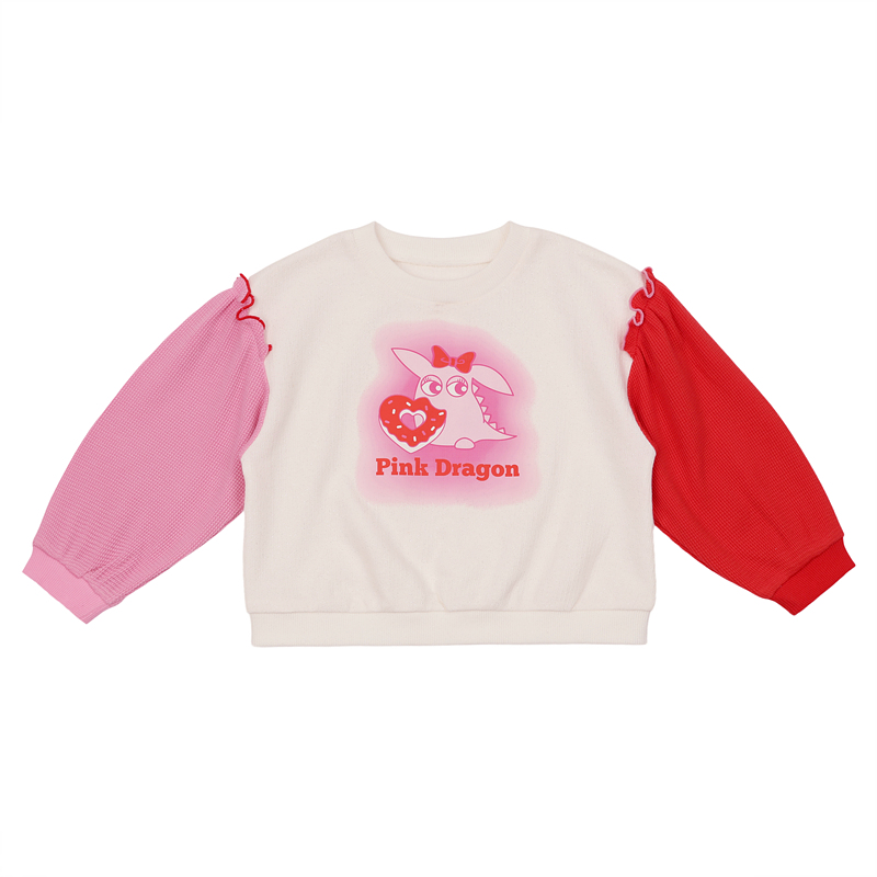 -좌우 소매 핑크 레드 배색과 어깨에 프릴포인트 그리고 앞판 핑크드래곤 실사나염이 너무 사랑스러워요.