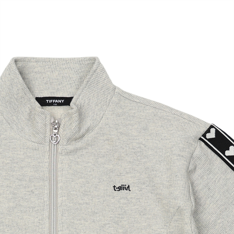신축성 있는 쥬리 원단으로 디자인된 집업 점 입니다. 잔잔한 펄이 원단 위 포인트로 올라가 있어서 발랄한 느낌을 줍니다. 소매에 블랙 하트 자카드 TAPE으로 포인트를 주었습니다.